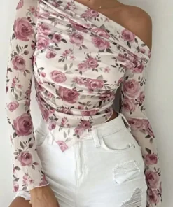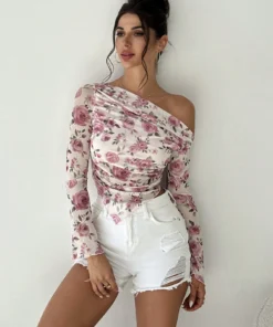 Spring and Autumn women’s elegant romantic flower print long sleeve irregular hem T-shirt