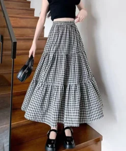 Summer Black White Plaid Skirts Women Korean Temperament Fashion Long Skirt Ladies Casual High Waist Fold Student A-Line Skirts