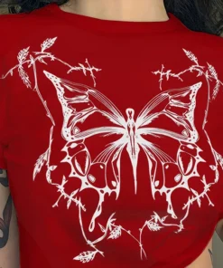 Vintage Fairy Grunge Butterfly Print Short Sleeve O-Neck Fitted Crop Top Punk Harajuku E-girl Tee American Y2K 90S Women T-shirt