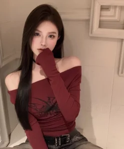 T Shirt Women Long Sleeve Off Shoulder Y2k Vintage Tops Streetwear Korean Style Crop Tops Autumn