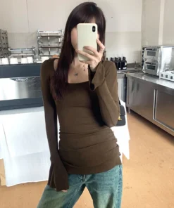 Sweet and spicy girl style sexy one neck tight long sleeved T-shirt for women Korean slim fit curved hem top
