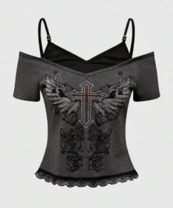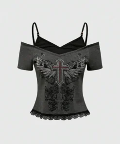 Vintage Fake two items Graphic Women Harajuku Y2k Aesthetic 2000s Oversized Sexy Off Shoulder Short Sleeve T-shirts Grunge
