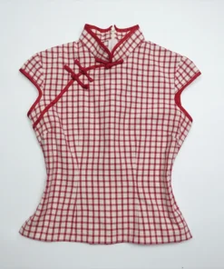 Vintage Aesthetic Women’s Plaid Cheongsam Top Sexy Slim Fit Chic Short Sleeve O-Neck Crop Tops 2000s Harajuku Hottie Streetwear