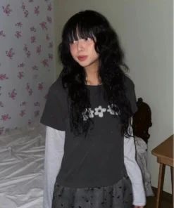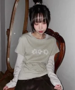 Woman T Shirts Y2k Tops O-neck Fake Two Contrast Color Striped Tees Long Sleeve Floral Camisetas Chic Casual Tshirt Ropa Mujer