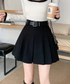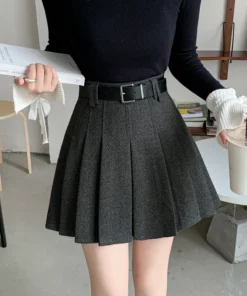 Vintage Winter Pleated Mini Skirt Women Streetwear High Waist Woolen Cute Skater Skirts With Shorts Belt Grey Black Skirt Woman