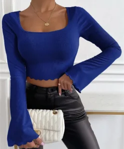 Women Chic T-Shirts Spring Summer Solid Color Flare Long Sleeve Square Neck Cropped Tops Office Party Casual Basic Pullover Tops