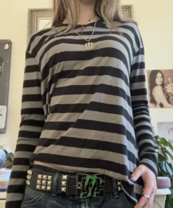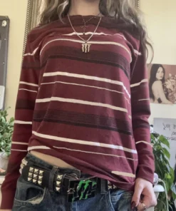 Y2k Teen Striped Long Sleeve T-Shirts Fairy Grunge Print Baggy Tops Vintage Harajuku 2000s E-Girl Shirts Vintage Streetwear