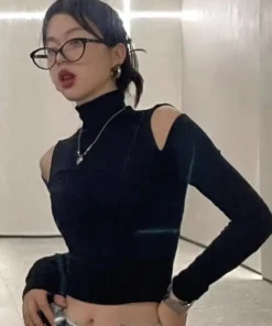 Y2k Vintage Turtleneck Falls Long sleeve T shirt Women Sexy Off shoulder Basic Tops Korean Fashion Crop Top Lady Black Tees
