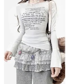 Y2K women’s round neck slim fit top, street style printed letter slit flared sleeve T-shirt top
