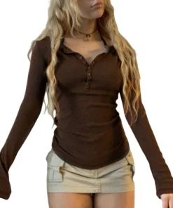 Y2K Women Basic Crop Top Fairy Grunge Long Sleeve Button Slim Fit Brown Tee Harajuku Aesthetic T-shirt 2000s Vintage Streetwear