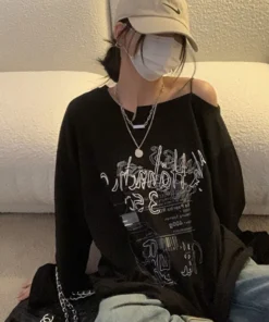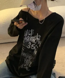 Y2K T-shirt Fairy Grunge 2024 Vintage Letter Print Tops Black Autumn Off Shoulder Long Sleeved Korean Tees Loose Harajuku Shirt