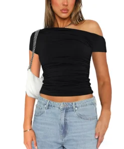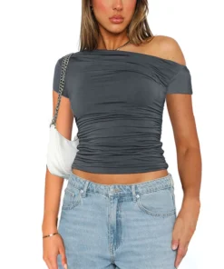 High Elasticity Fabric Solid Color Slash Shoulder Short Sleeve Shrinkage Pleated Navel Reveal Top Ladies Casual Tops