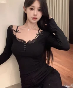 Halter Neck Lace Trim Bow Cute Black Y2K T-Shirt Women Button Up Slim Long Sleeve White Tees Sweet Balletcore Clothing Harajuku