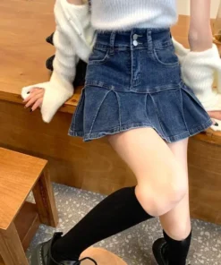 High-Waisted Denim Skirt Women’s New Pleated Retro Blue Skinny A-line Flanged Wrap Hip Skirt