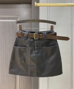 High waisted leather half body women’s 2024 autumn winter new A-line retro PU leather short skirt, coffee leather skirt