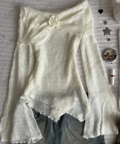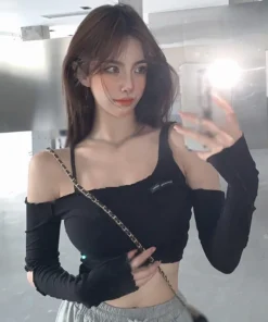 Off Shoulder Crop Top Autumn Women Sexy Hollow Out Long Sleeve Tee Shirt Slim Skinny Ribbed Knitted T-shirt Irregular Tops
