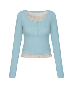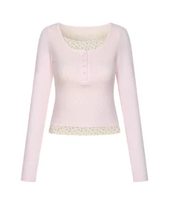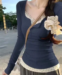 New Women’s Long Sleeve T-shirt U Collar Spring and Autumn Slim Top French Style Women’s Wear with Fake Two Lace Edge Y2k Top