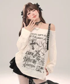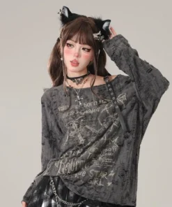 Y2K Emo Girl Gothic Letters Printed Casual Long Sleeve T-Shirt Harajuku Retro Punk Rock Hip Hop Aesthetic Top Women’s Streetwear