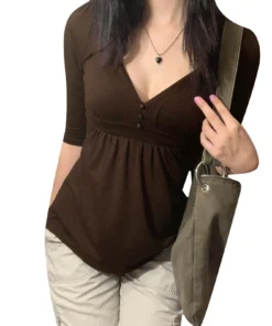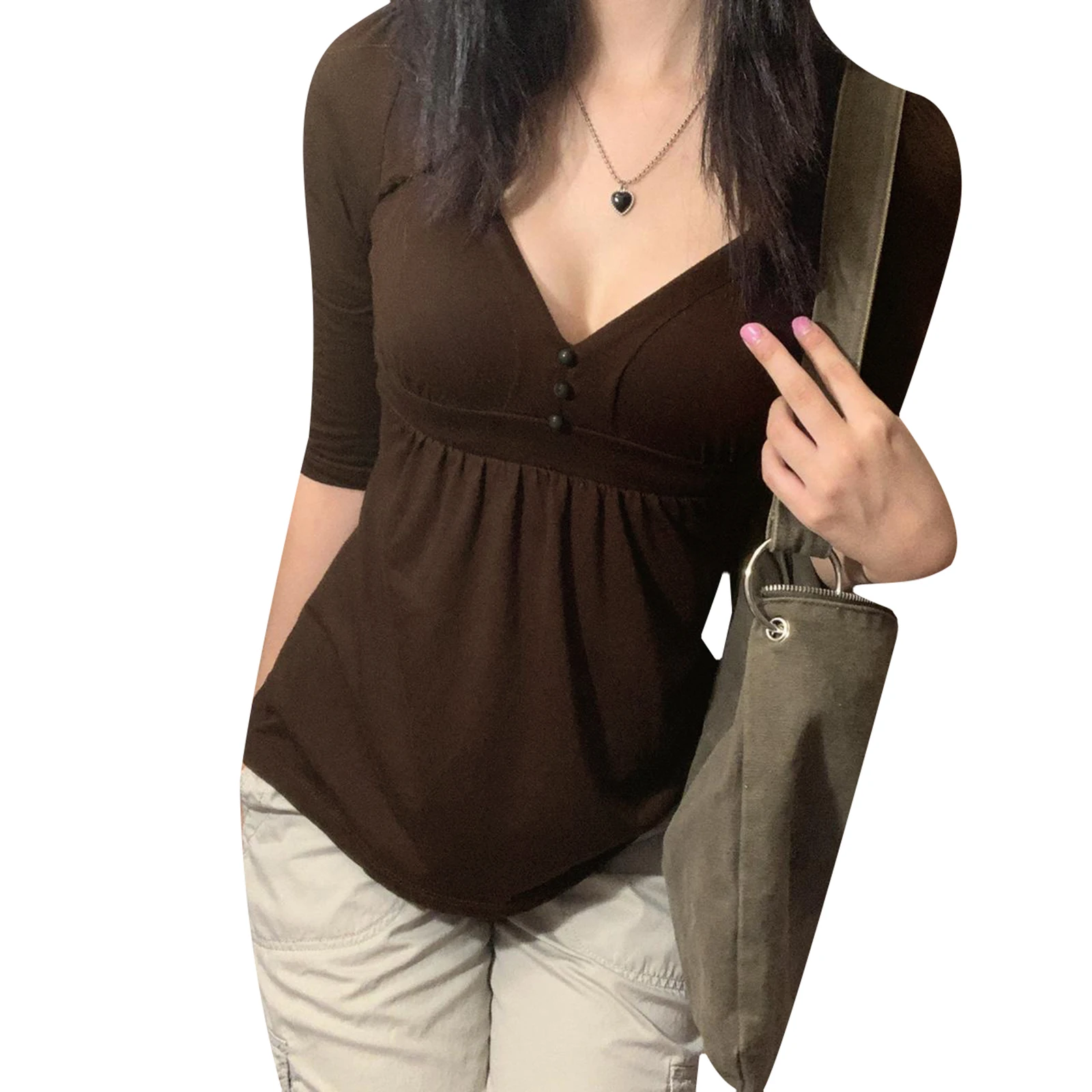 2000s Women’s Clothing Solid Color Shirt, Elbow Length Sleeve V-neck Button Decor Chest Loose Hem Tops Tee for Female
