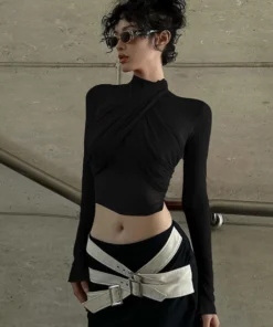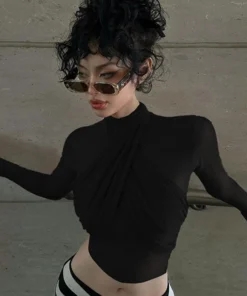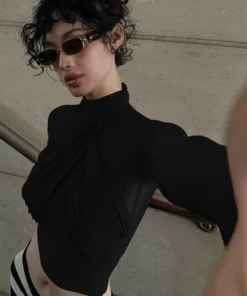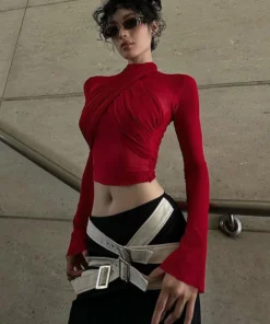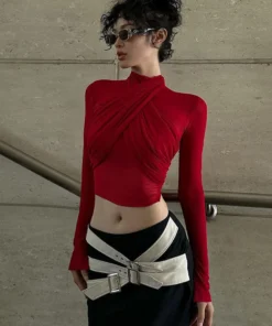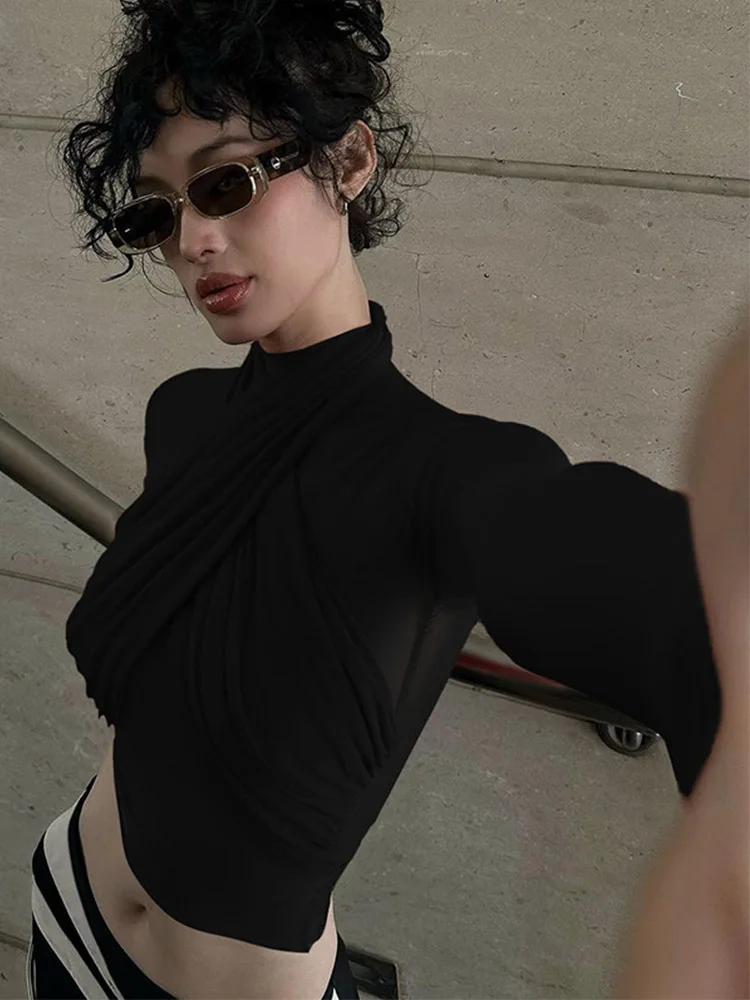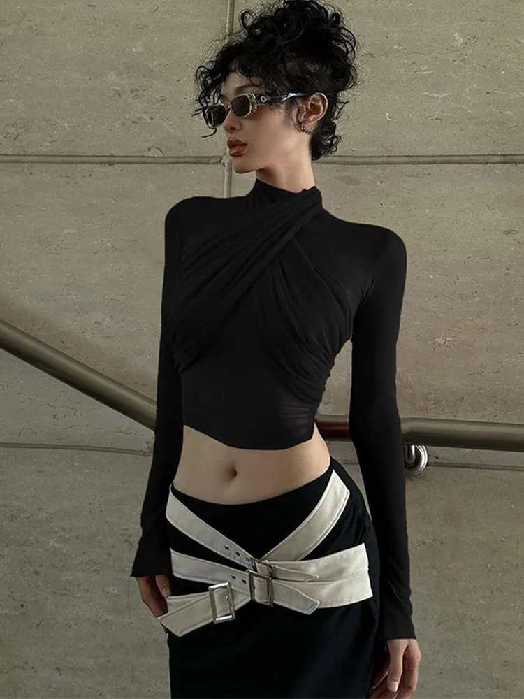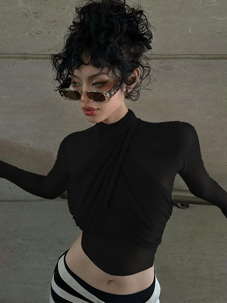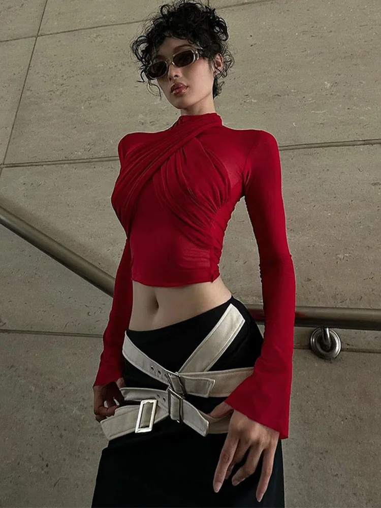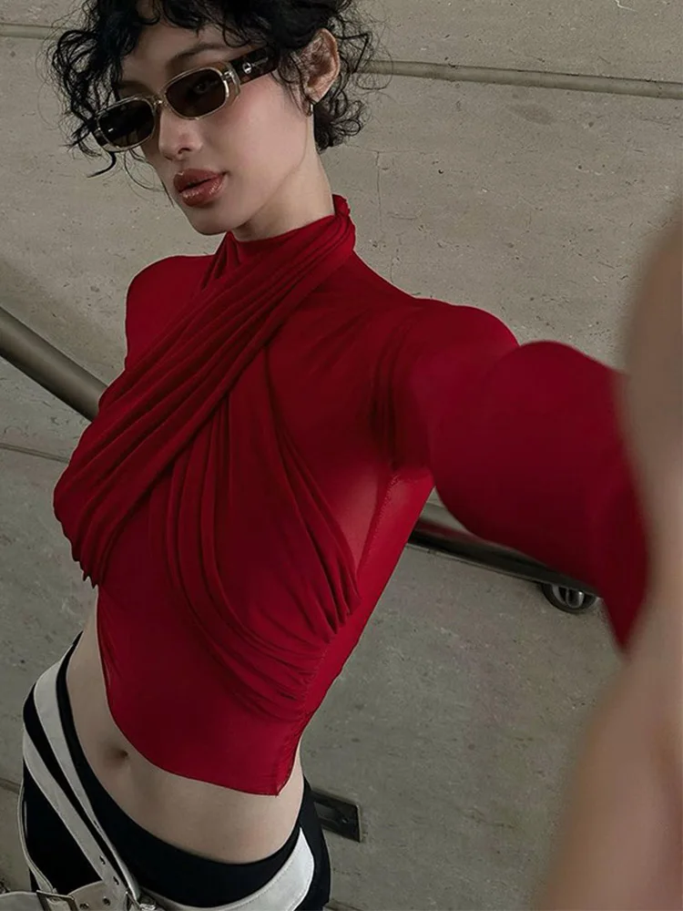 2025 Spring Fashion Mesh Turtleneck Long Sleeve Red Draped Bandage Sexy See Through Crop T-Shirt Top Streetwear Club