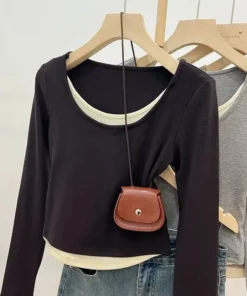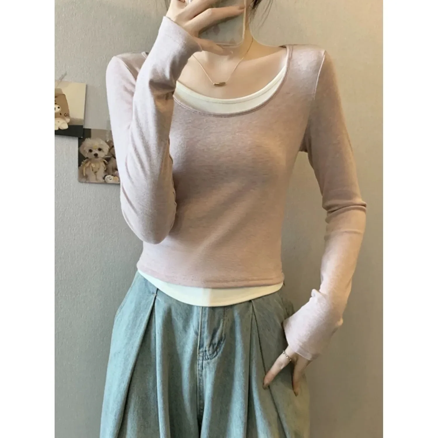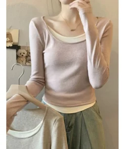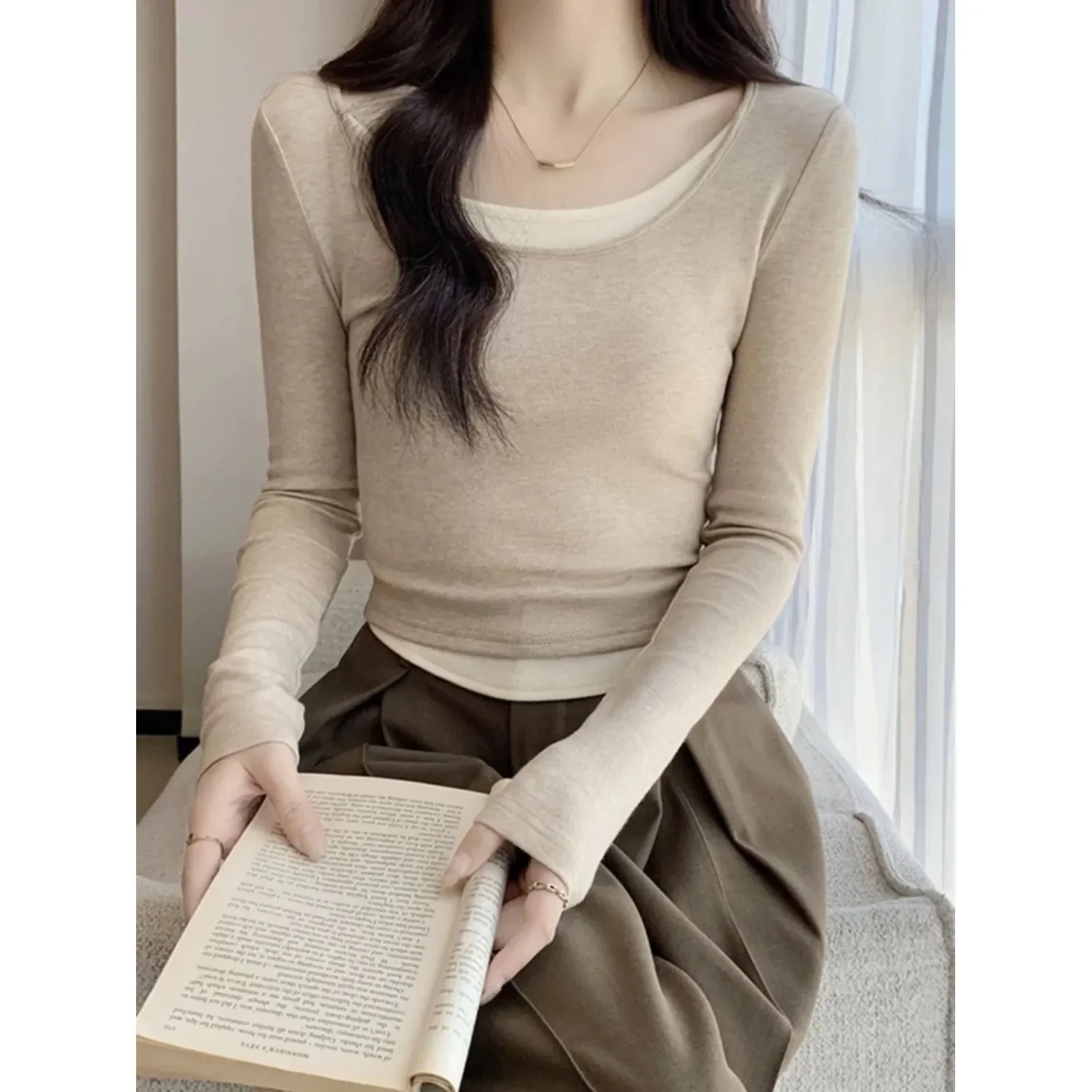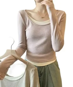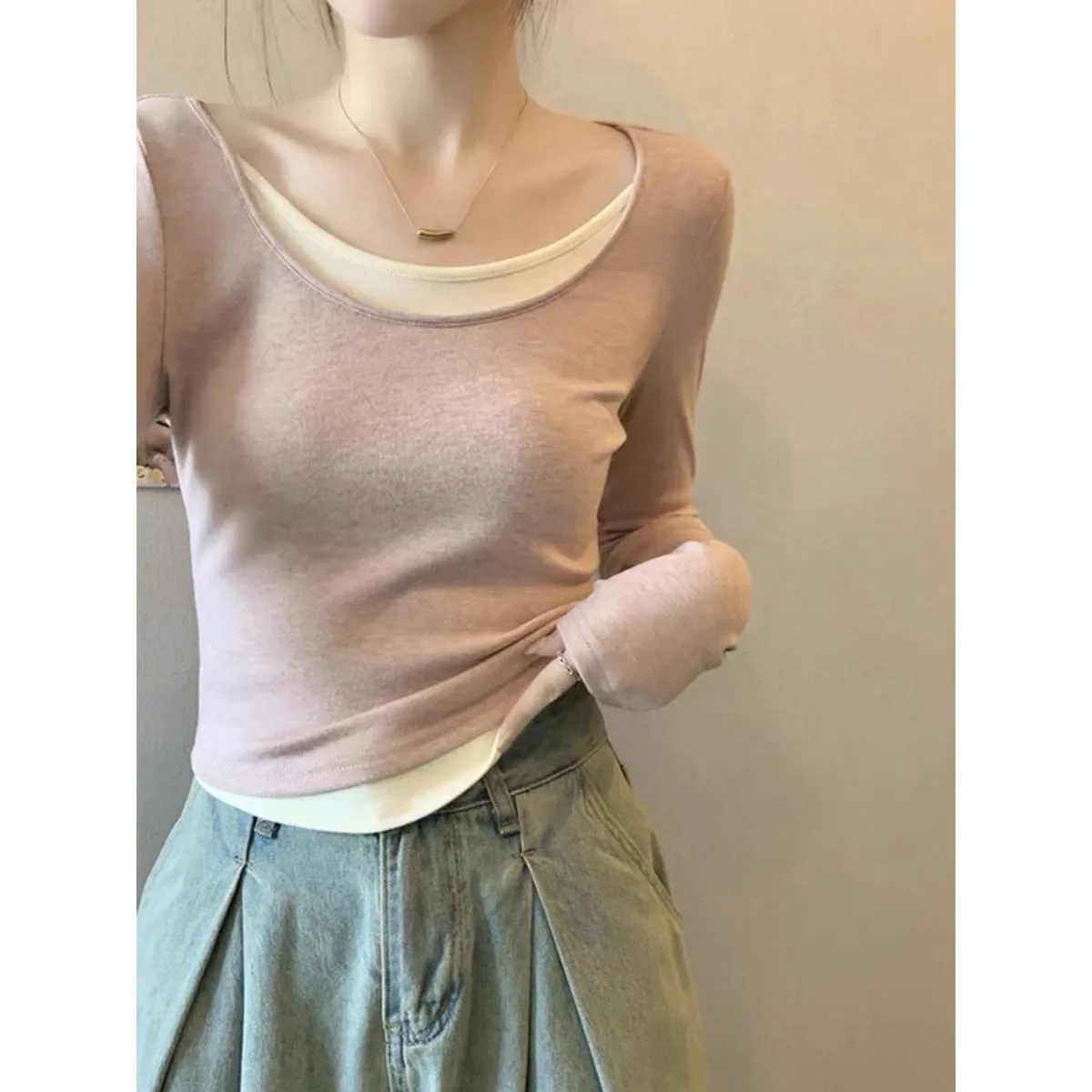 Autumn Women’s Slim Fit Long Sleeve T-Shirt Color Block Design Crew Neck Base Shirt Inner Wear Fashionable Youthful Style
