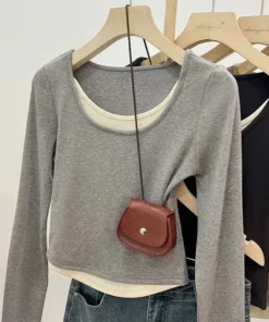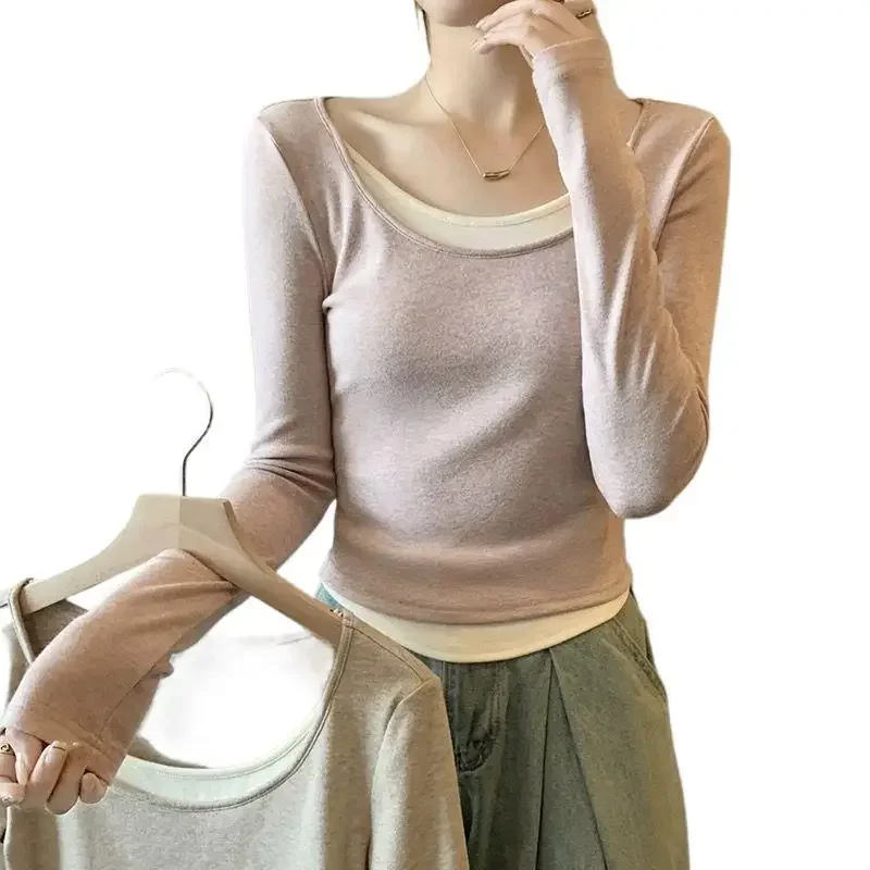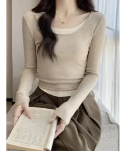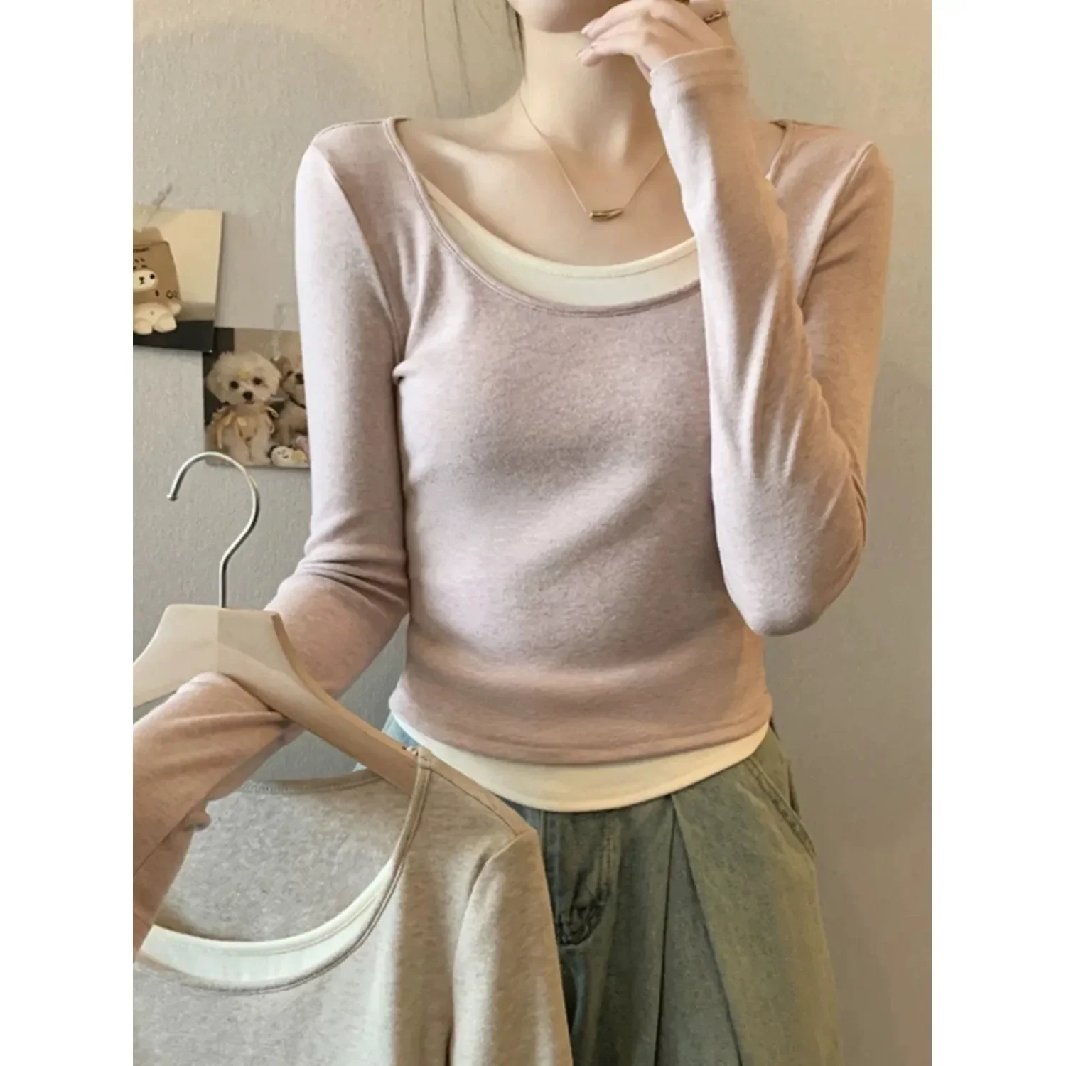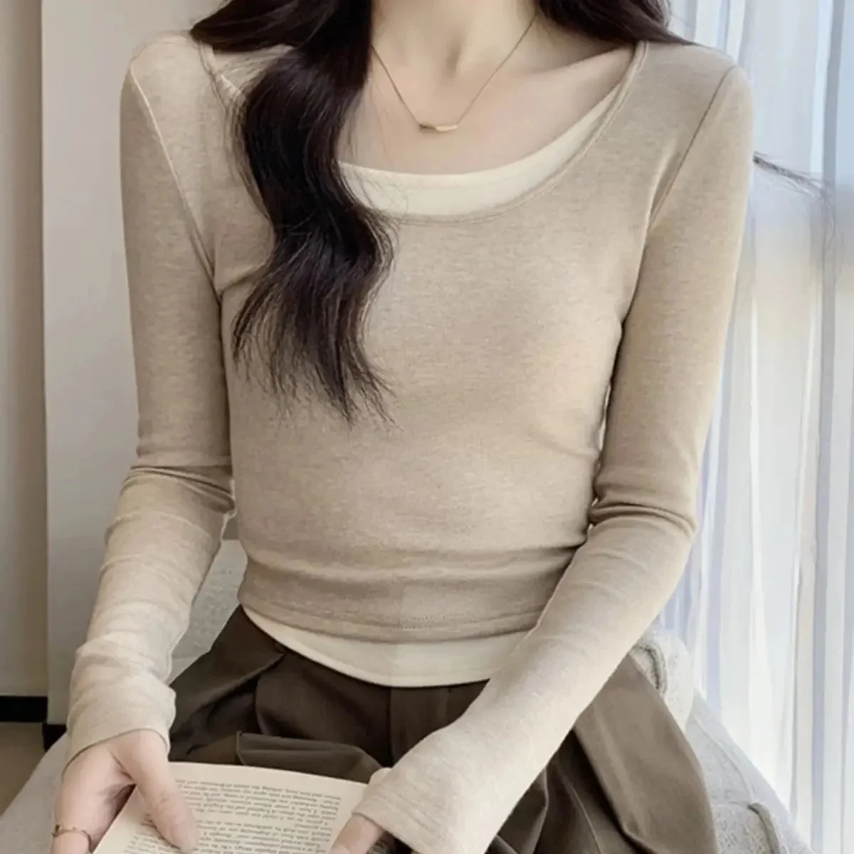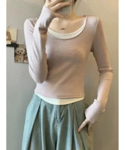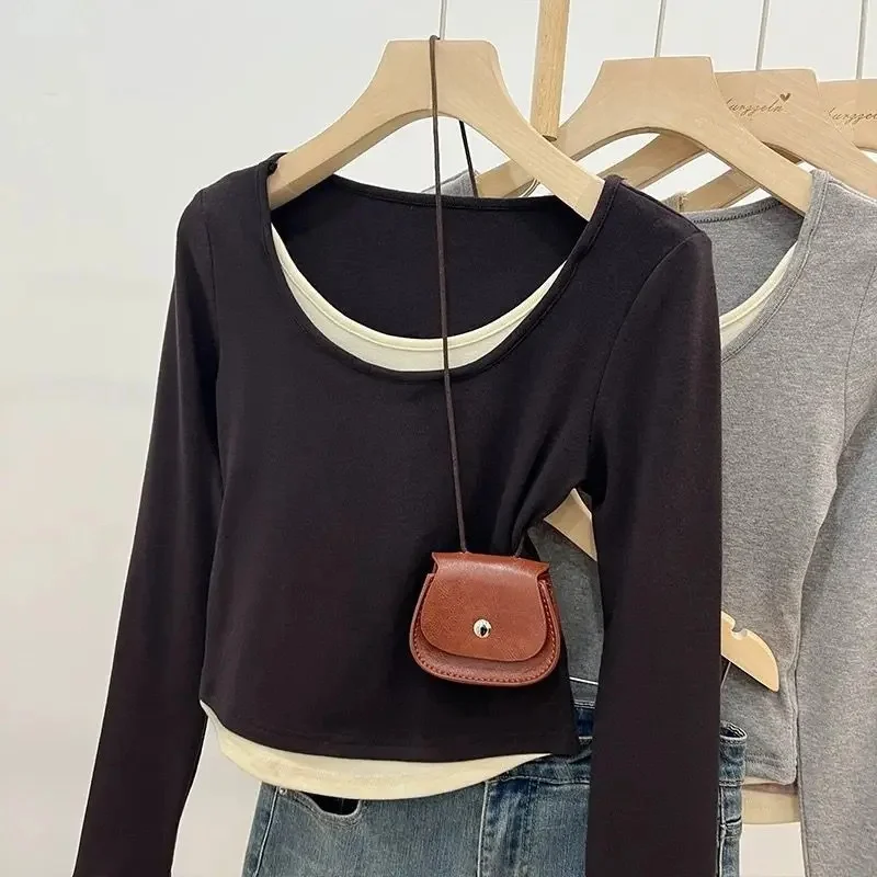 Autumn Women’s Slim Fit Long Sleeve T-Shirt Color Block Design Crew Neck Base Shirt Inner Wear Fashionable Youthful Style