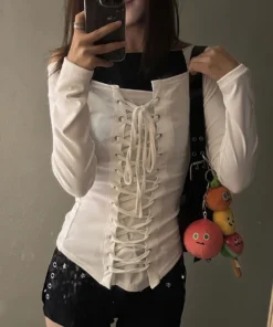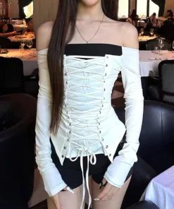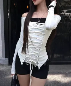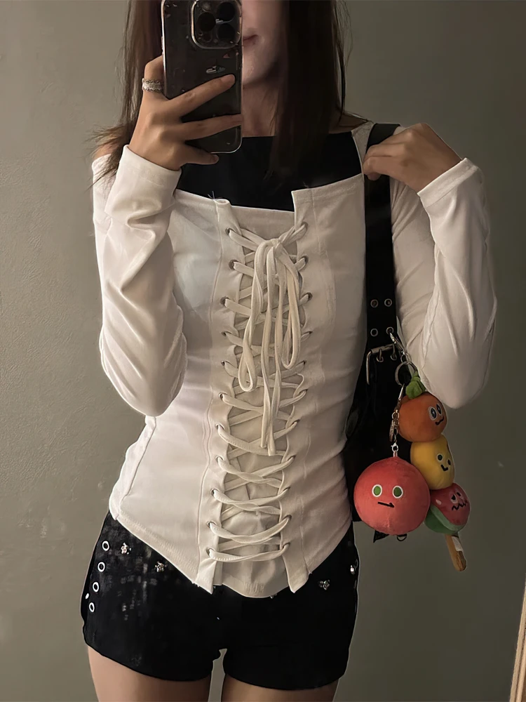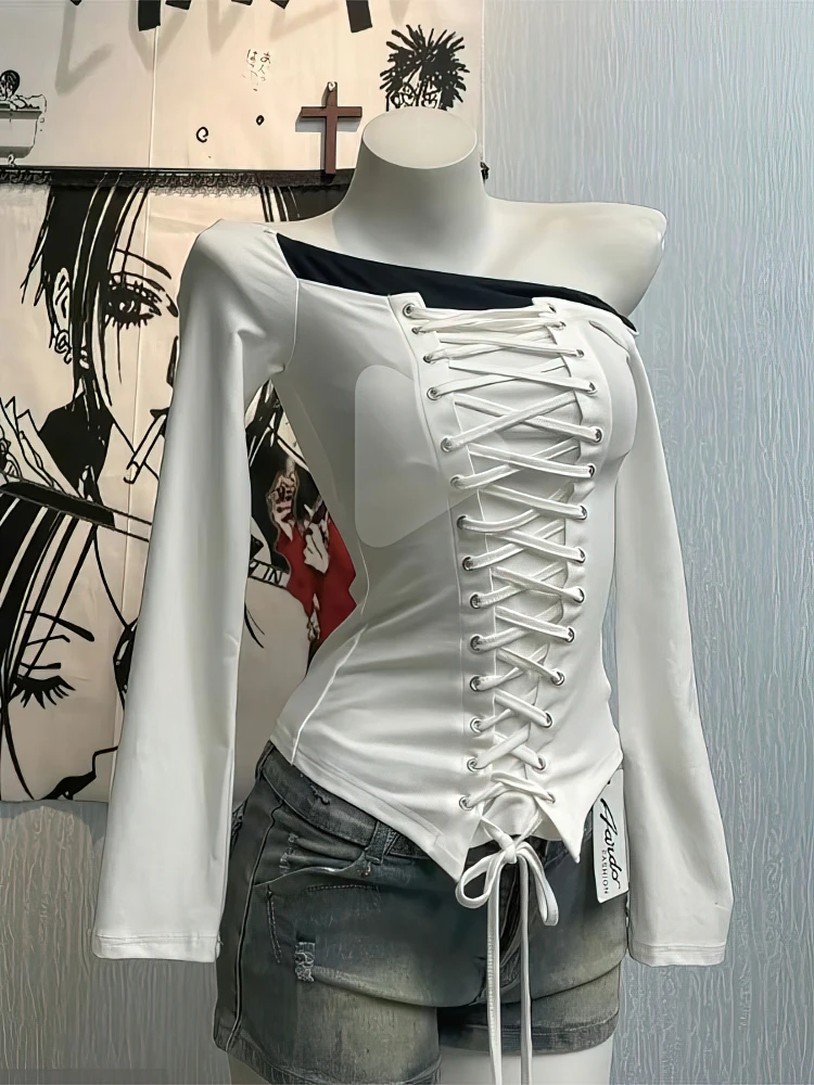 Bandage Long sleeve T shirt Women White Basic Off shoulder Top Slim Fit Lace up Bow Tied Blouse Sexy Tees Tunic Shirt