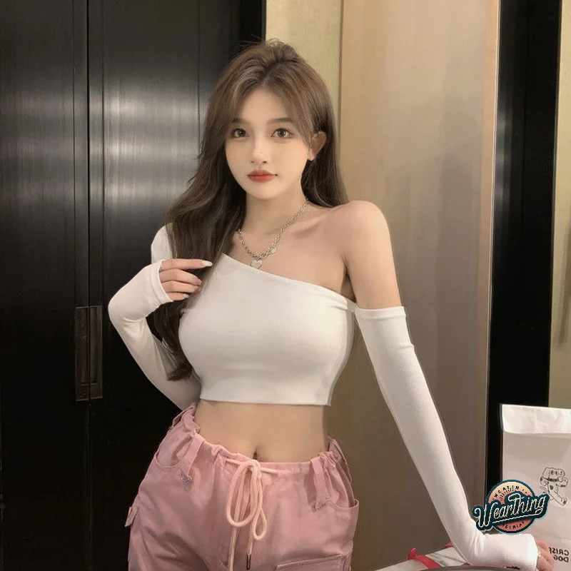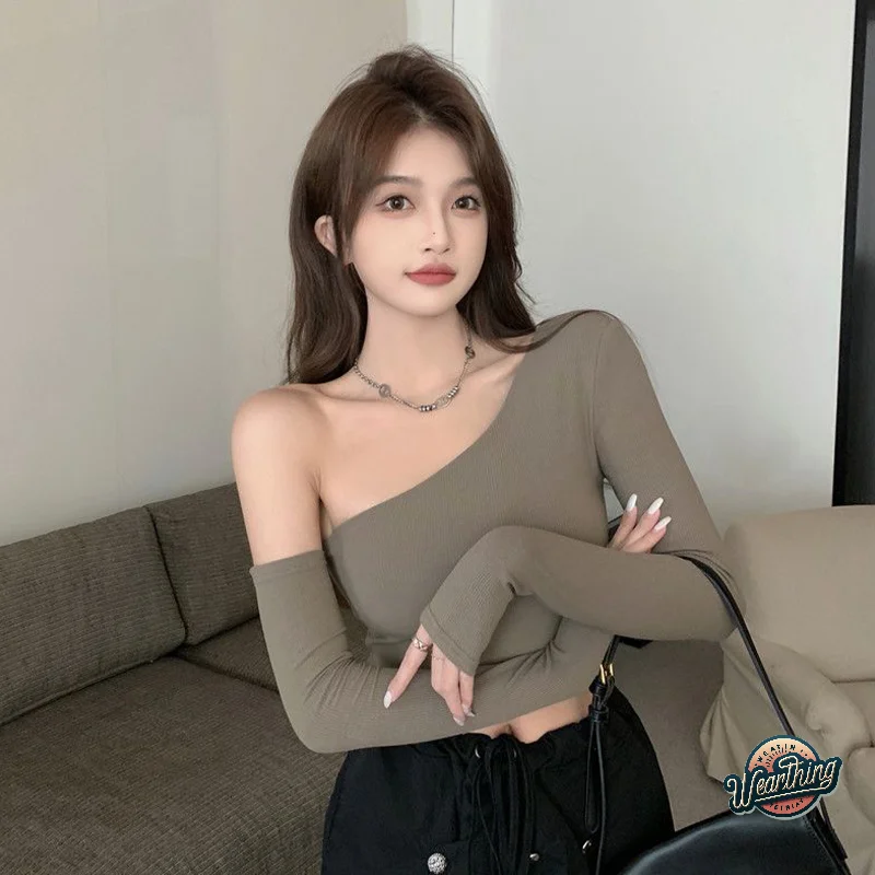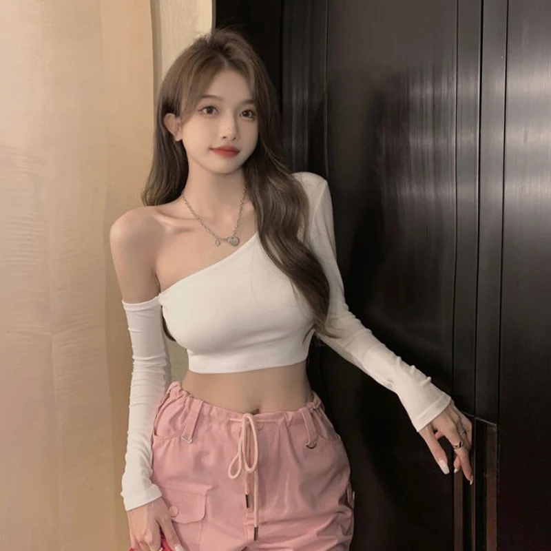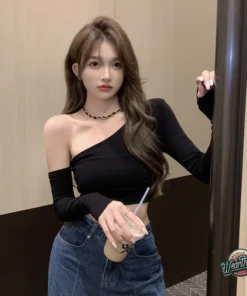 Fashion Chic Irregular Off-shoulder Long Sleeve T-shirt Women’s Y2K Sexy Slim Crop Top