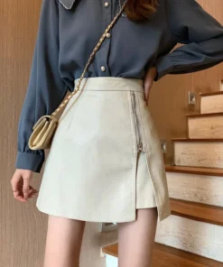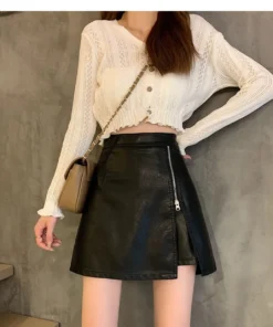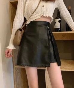 Fashionable PU Leather Mini Skirt High Waist A- Line Women’s Zipper Short Skirt Spring Autumn Slimming Skirt Half-length Skirt