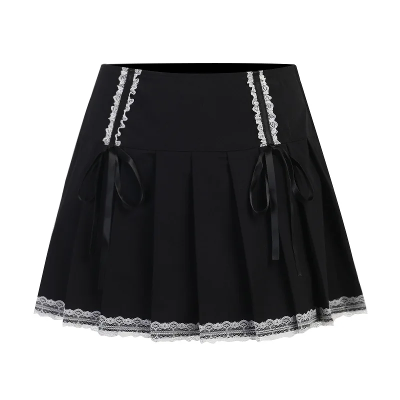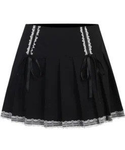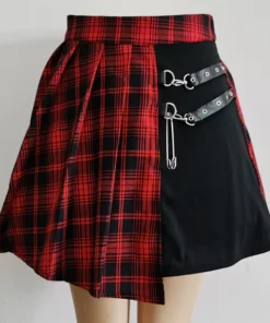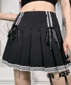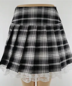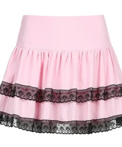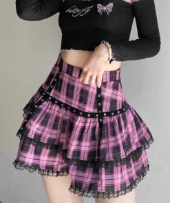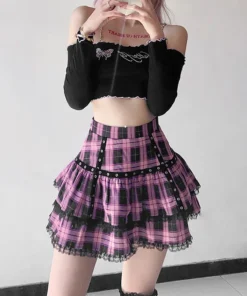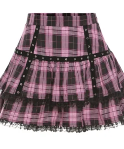FICHOR Mall Goth Gothic Lace Ruffle Mini Skirts Womens Harajuku Fairy Grunge Pink Plaid Pleated Skirt Japanese Lolita Streetwear