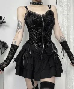 Gothic Black Lace Cross Mini Skirt Y2k Grunge Punk High Waist Pleated A-Line Skirts Vintage Women Girl Aesthetic Alt Clothes