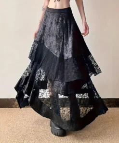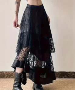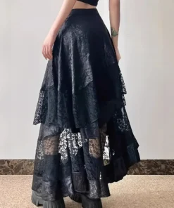 Gothic Vintage Black Midi Skirt Aesthetics Y2k Lace Irregular Skirt French Style Elegant Casual Skirt Woman Design Chic