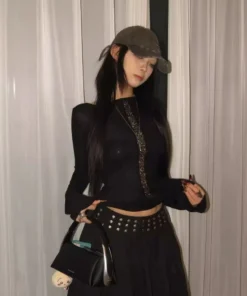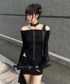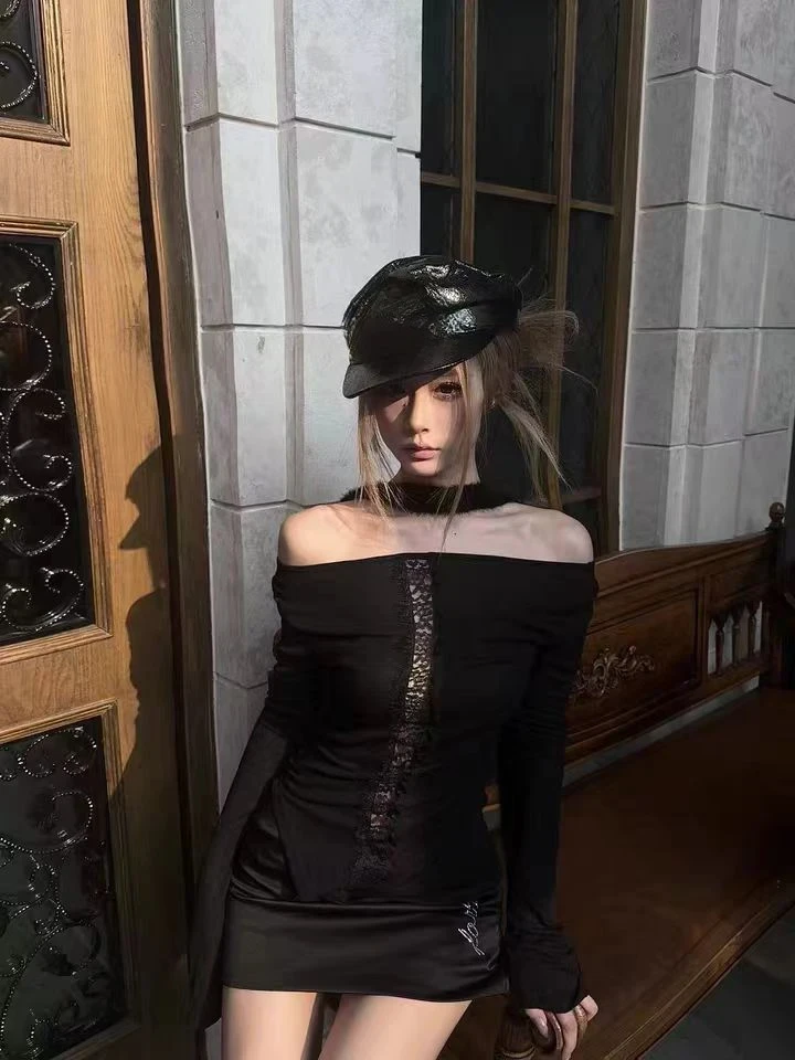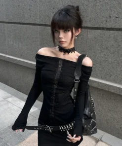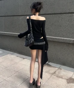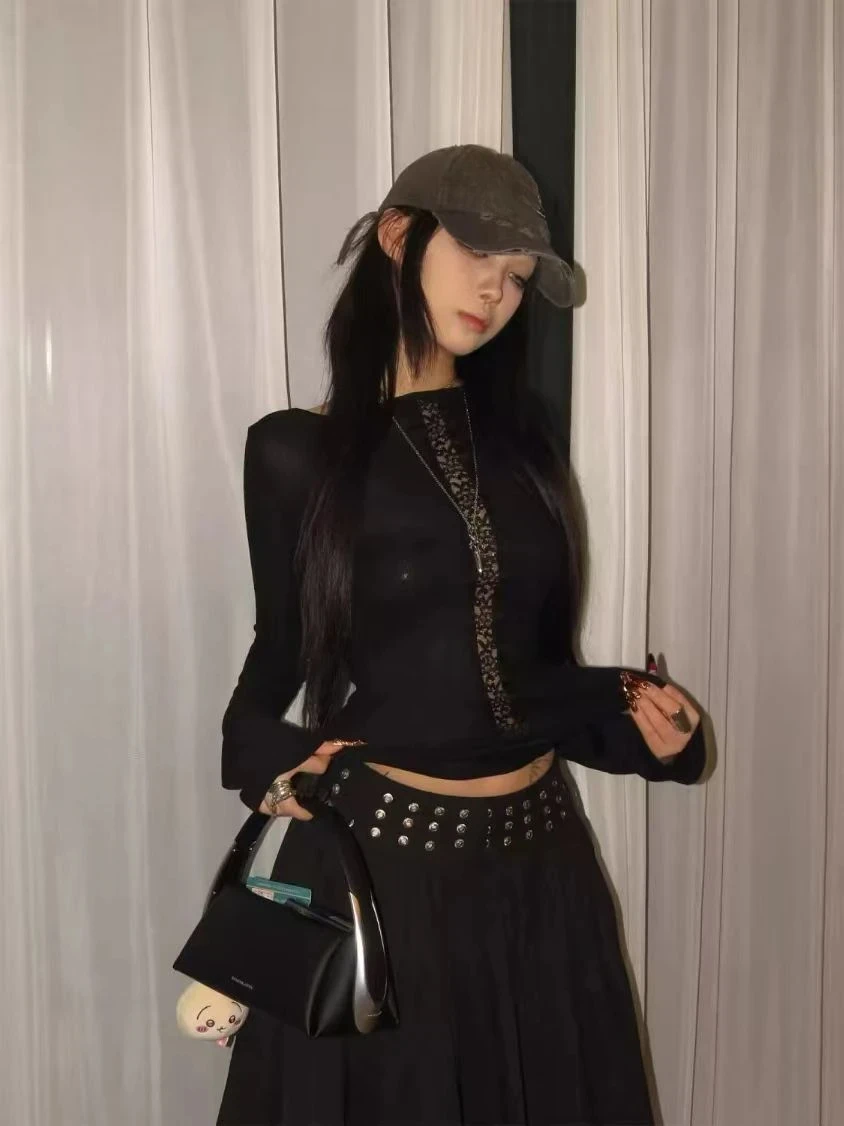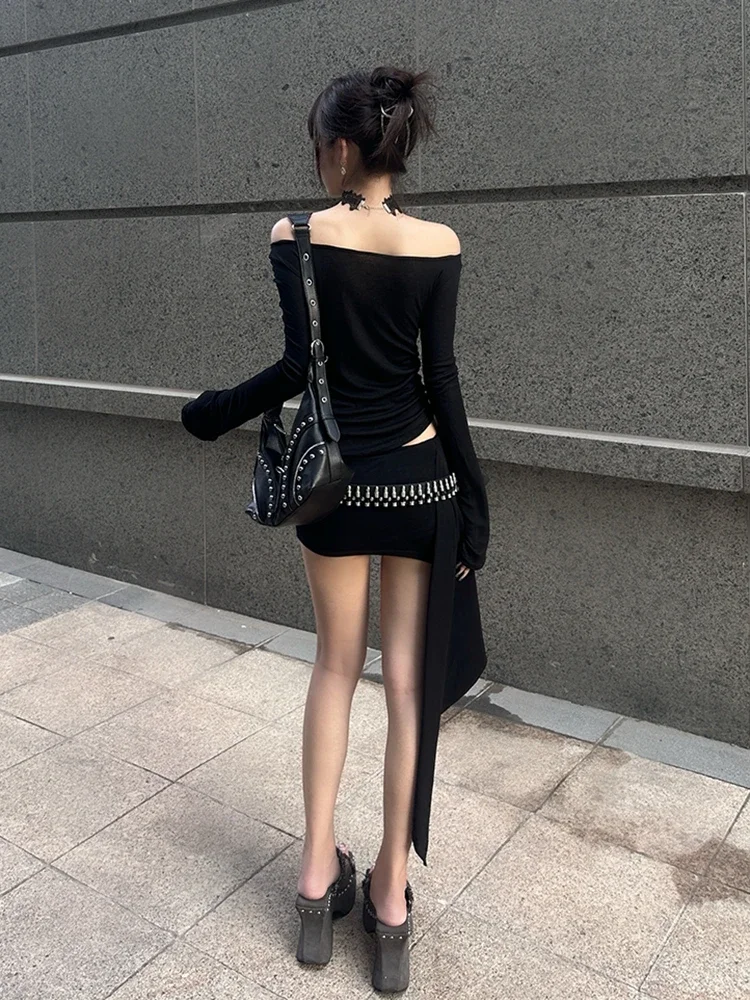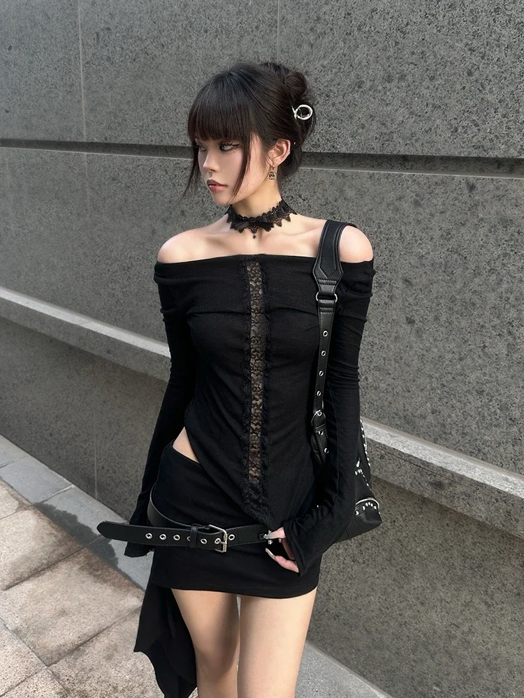 Harajuku Black T-shirt Women 2000s Y2k Korean Fashion Long Sleeve Hotsweet Tees Female Gothic Hollow Out Off Shoulder Tshirts