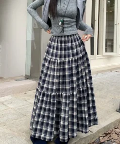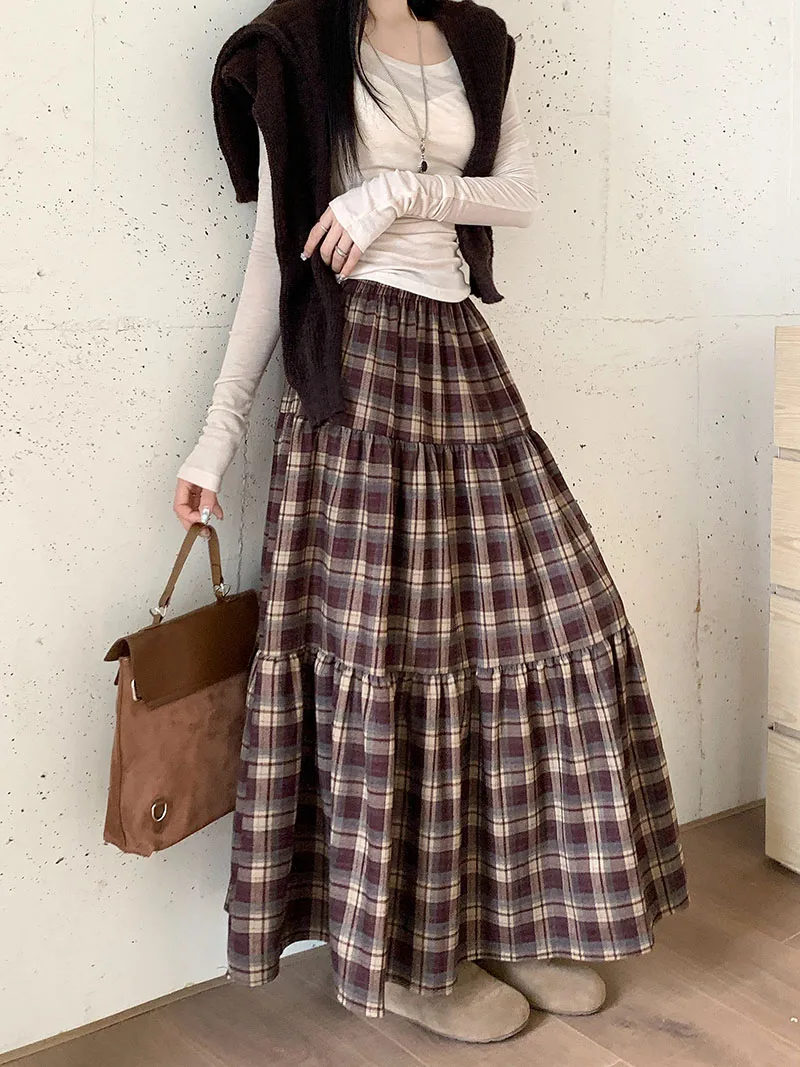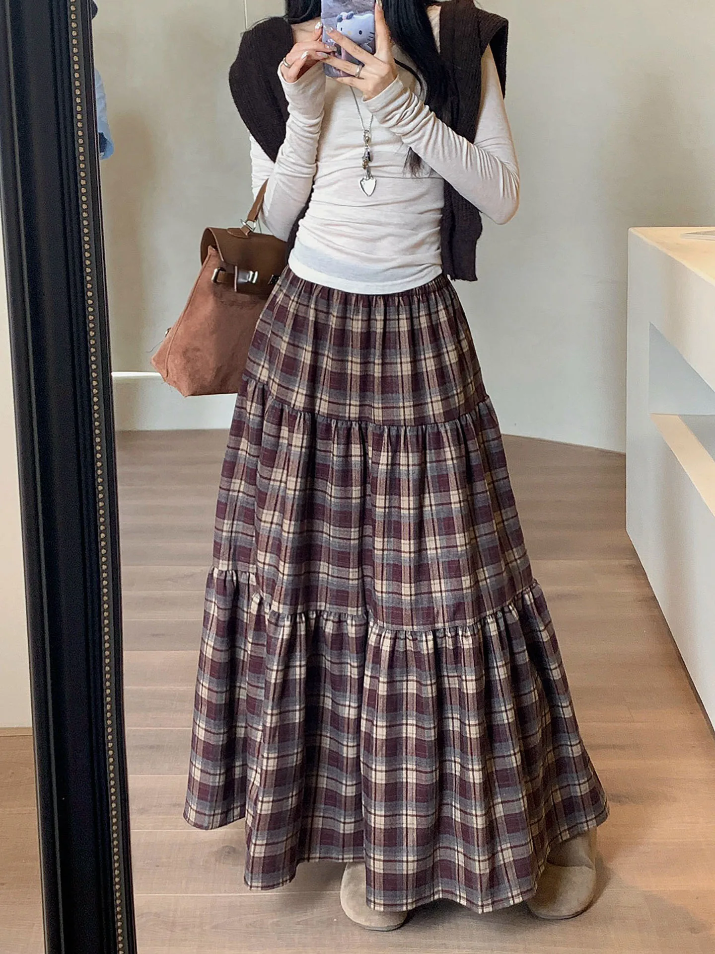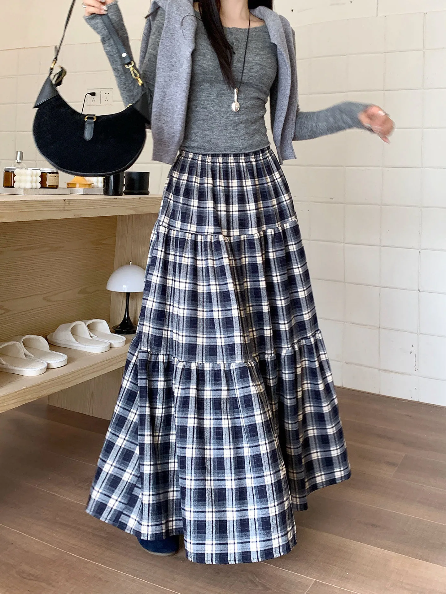 High Quality Plaid Long Skirt Women Korean Fashion Fall Winter A Line Maix Skirt Female Retro Elastic High Waist Faldas Mujer