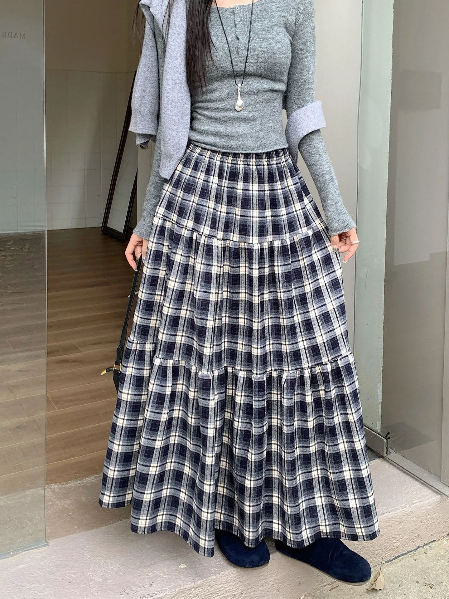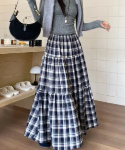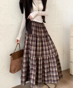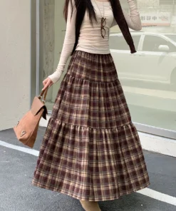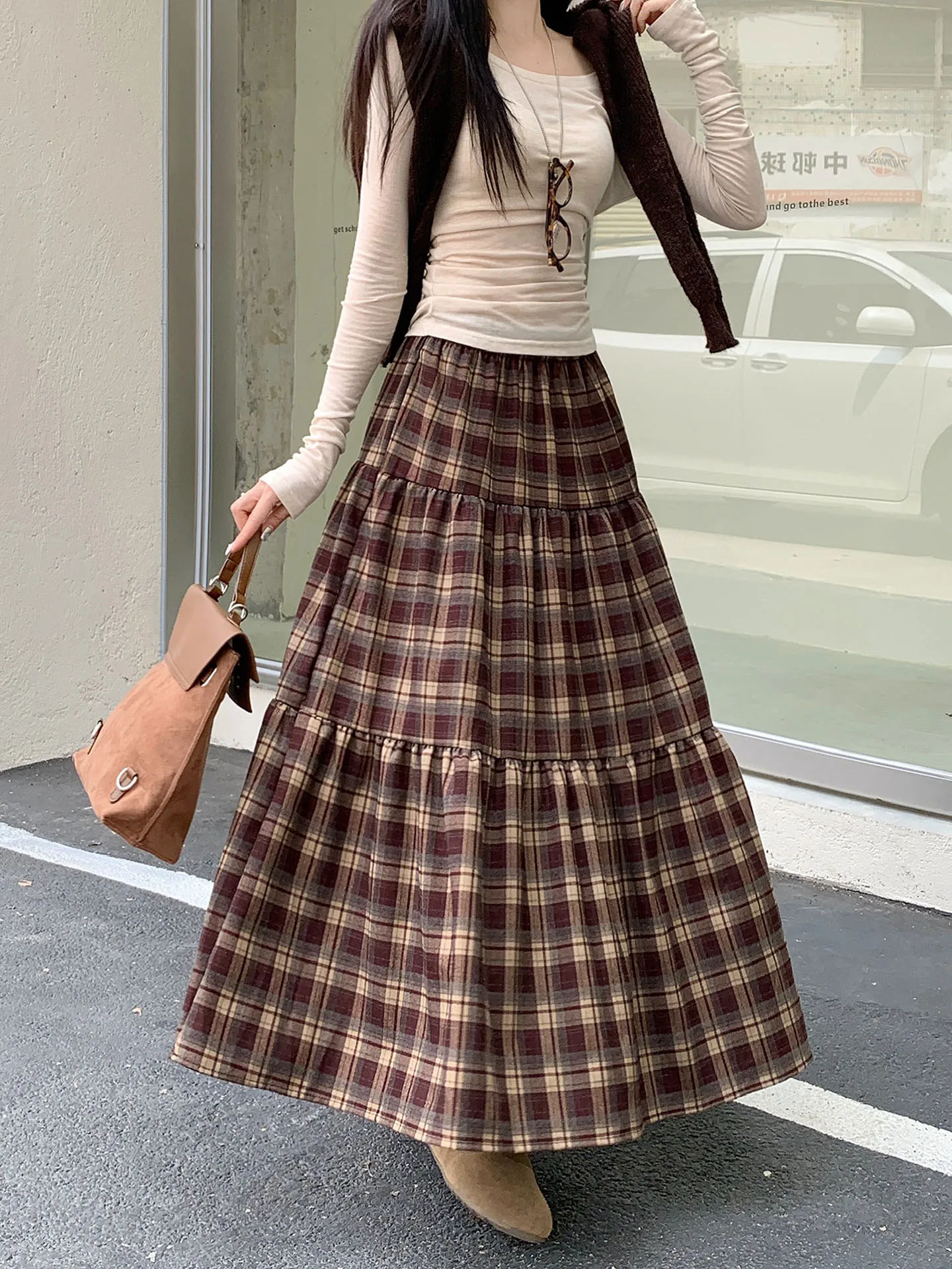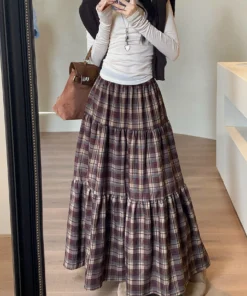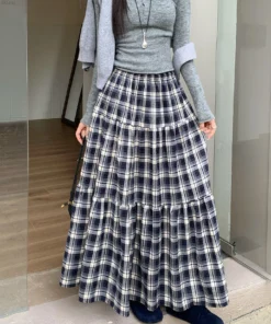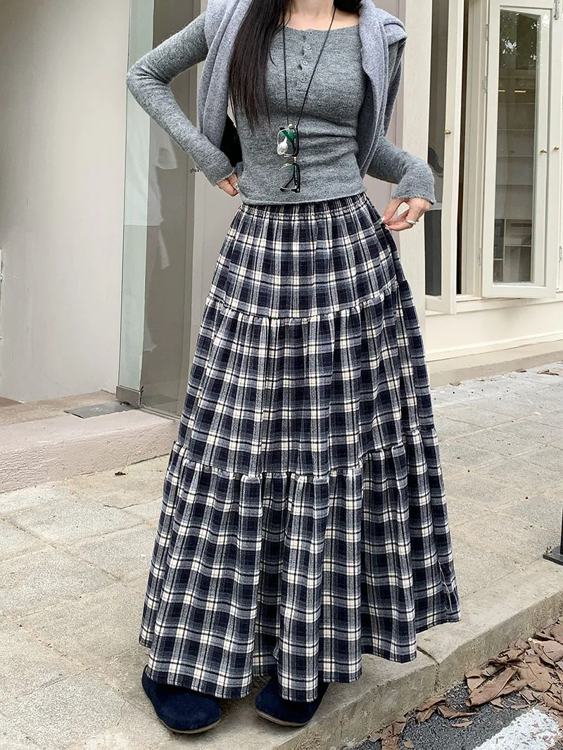 High Quality Plaid Long Skirt Women Korean Fashion Fall Winter A Line Maix Skirt Female Retro Elastic High Waist Faldas Mujer