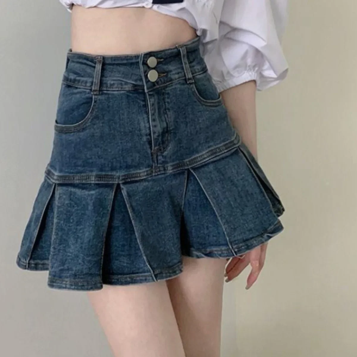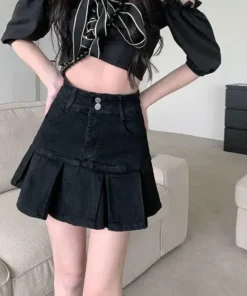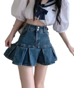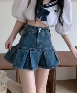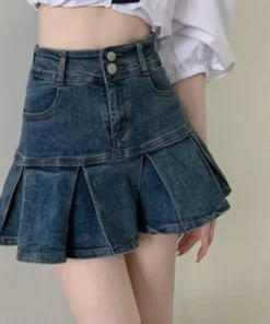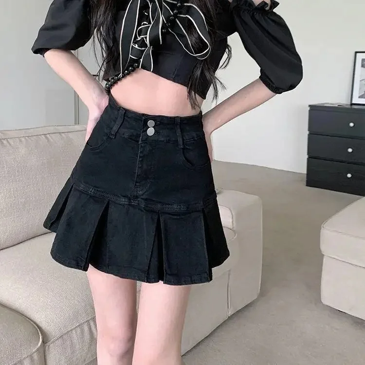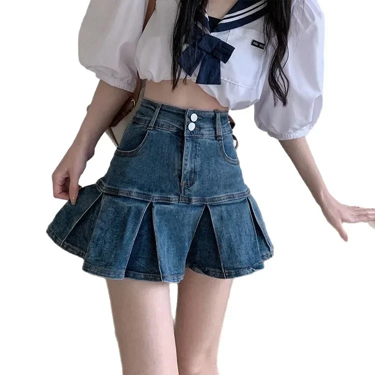 High Waist Pleated Denim Skirt Women’s Elastic Mini A- Line Hem Lace Trim Sexy Mini Skirt Summer New Arrival Bodycon Skirt