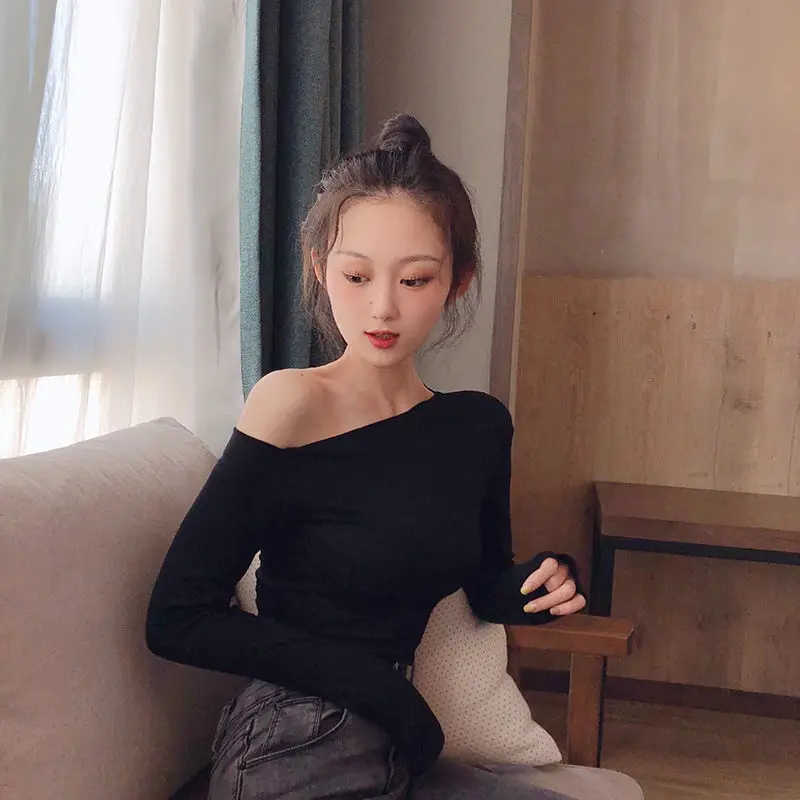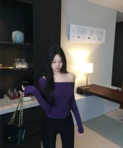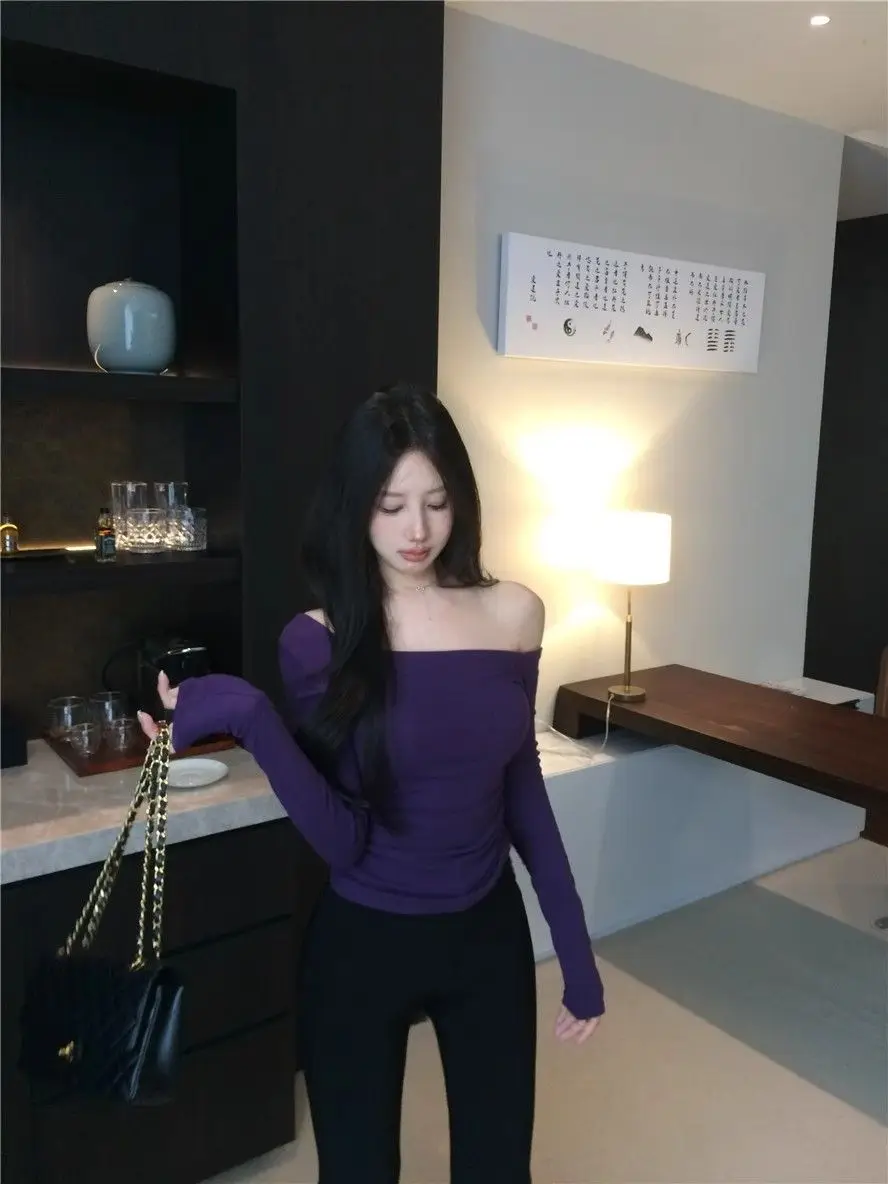 Hot Girl Purple Slant Collar Long Sleeve T-Shirt Women’s Autumn Tight Bottoming Shirt Sexy Short Off-The-Shoulder Niche Top