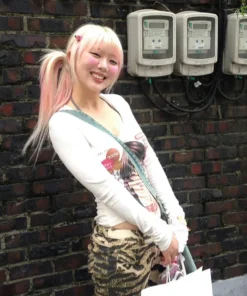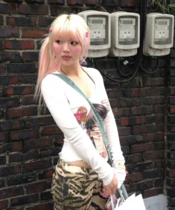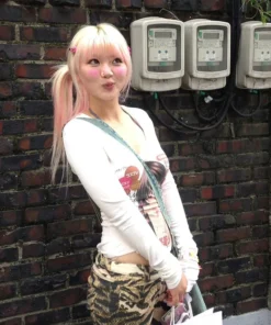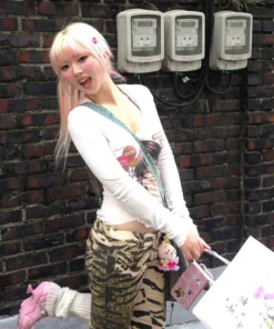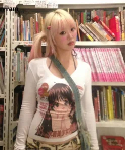 Karrram Japanese Y2k Anime Print T-shirt 2000s Aesthetics Long Sleeve Tee Shirt Vintage Harajuku V-neck White Tops Kawaii Lolita