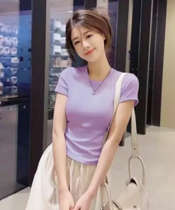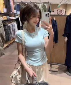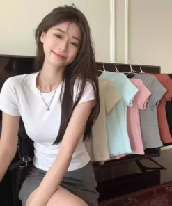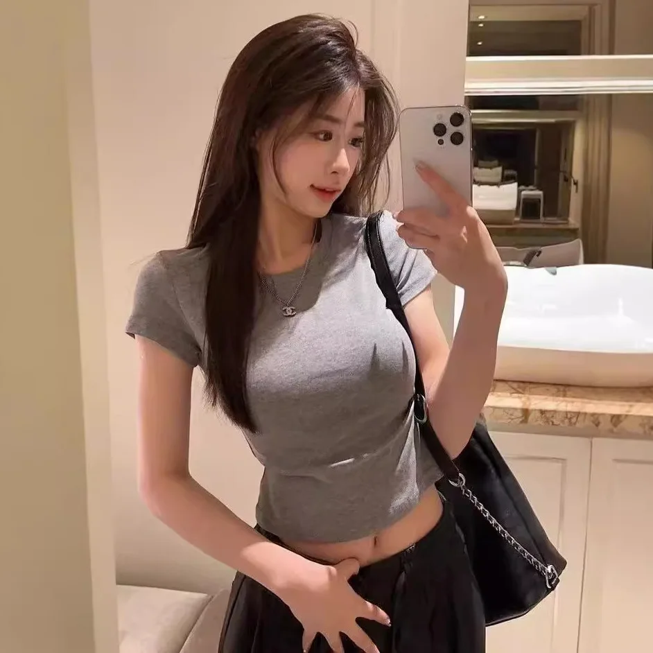Korean Basic White Black Top Lady Short Sleeve Crewneck Skinny T-shirt Summer Women Girl Top Solid Coolor Y2k Streetwear Tee