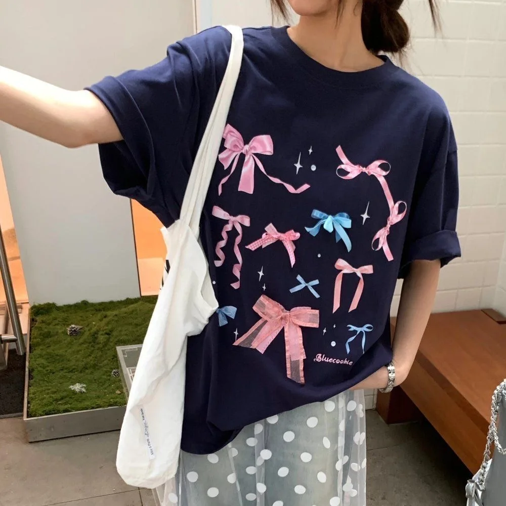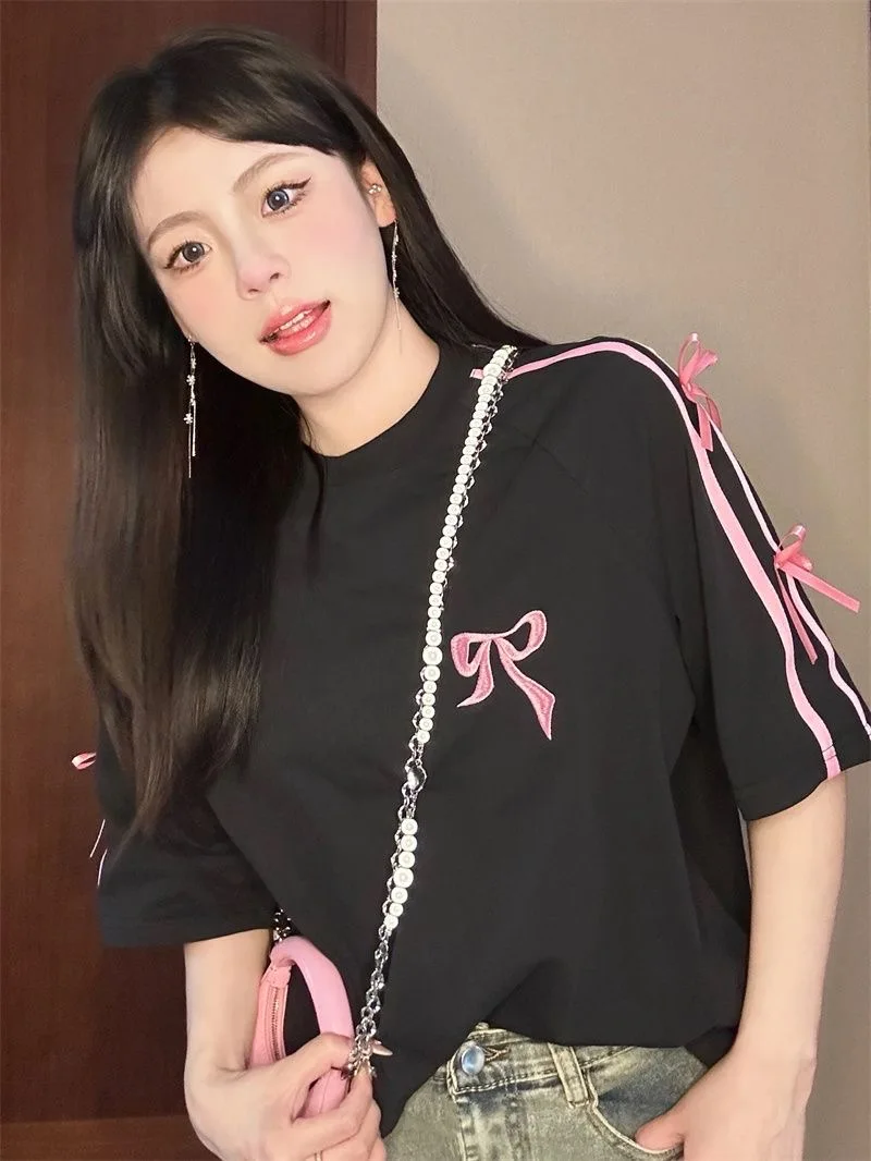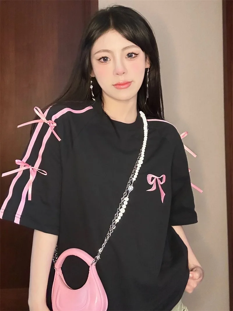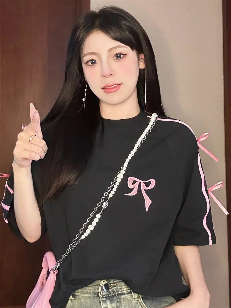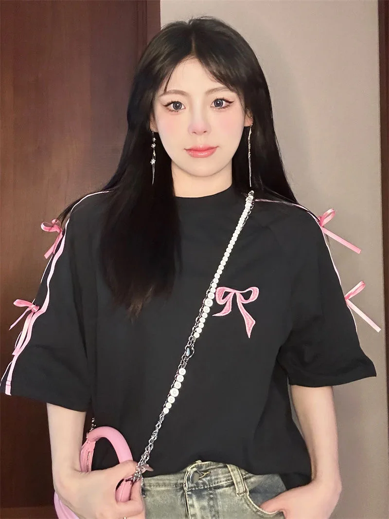 Korean style three-dimensional bow pure cotton short-sleeved summer new niche lady style design embroidered casual versatile top