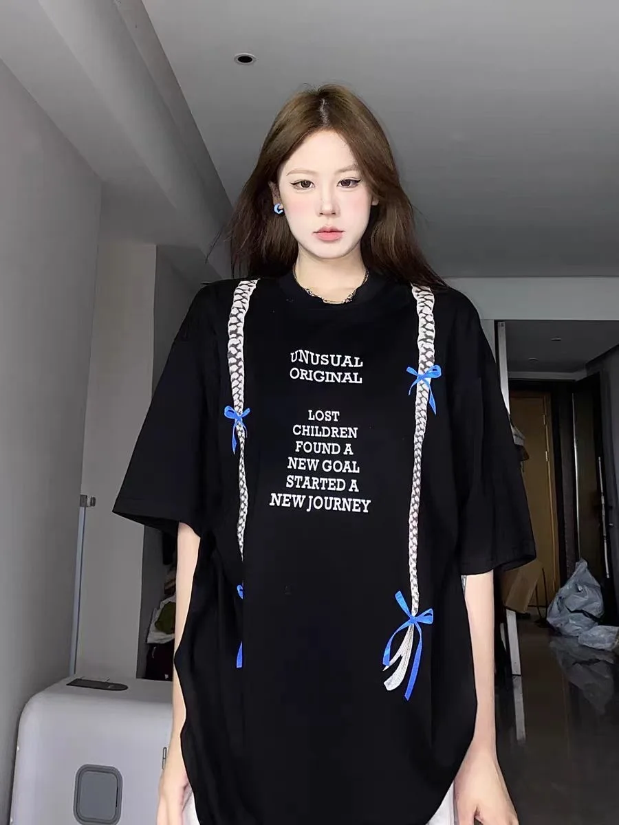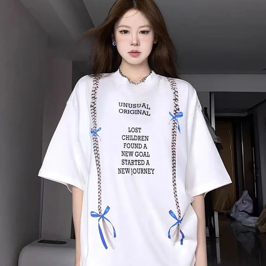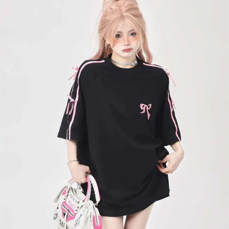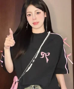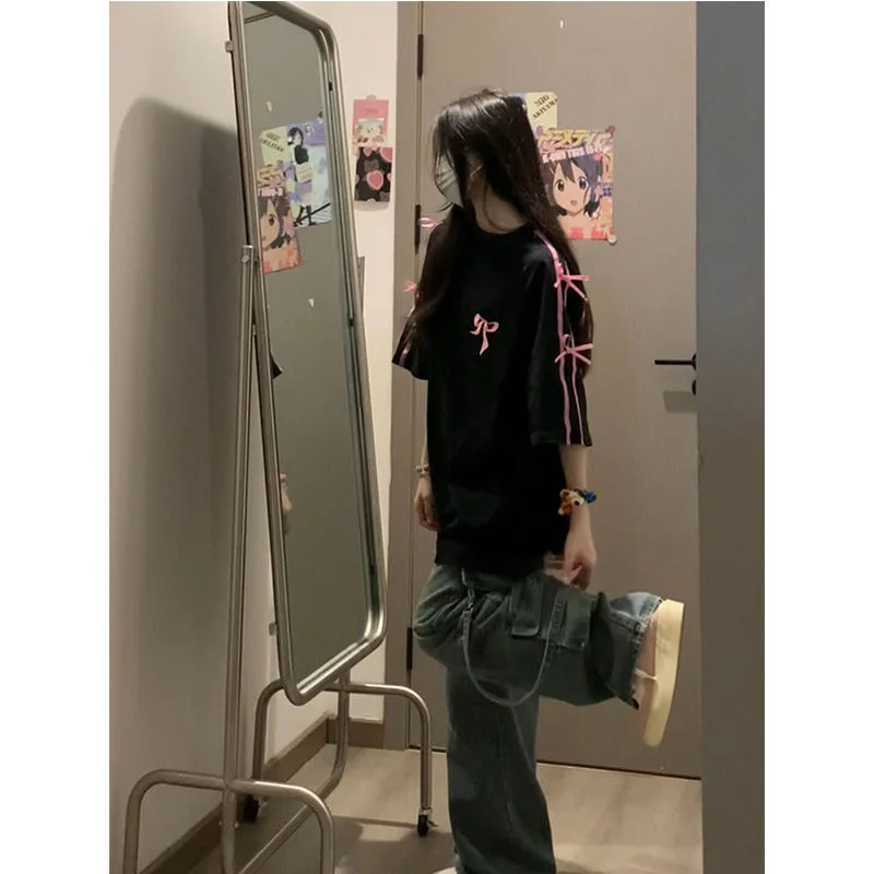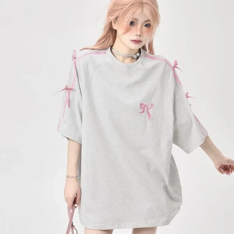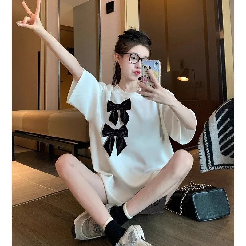 Korean style three-dimensional bow pure cotton short-sleeved summer new niche lady style design embroidered casual versatile top