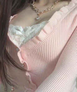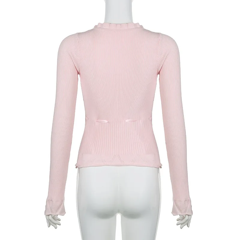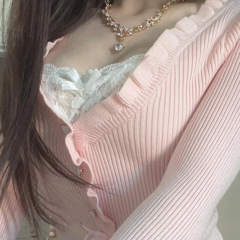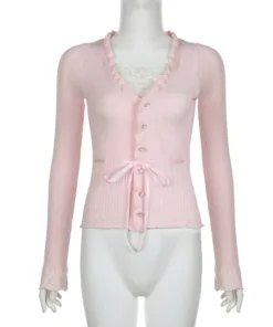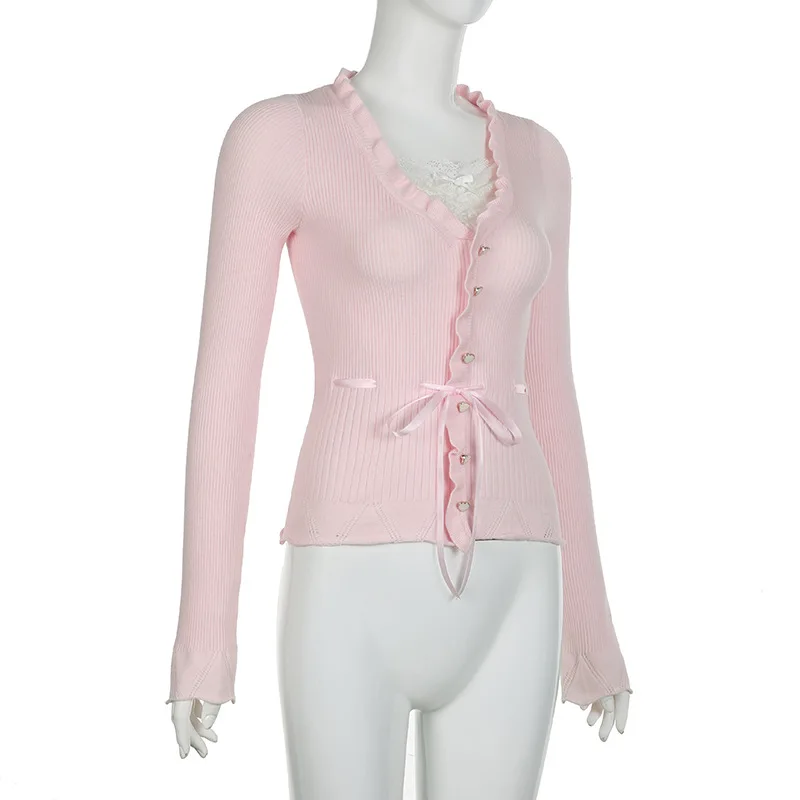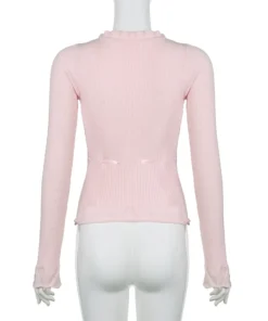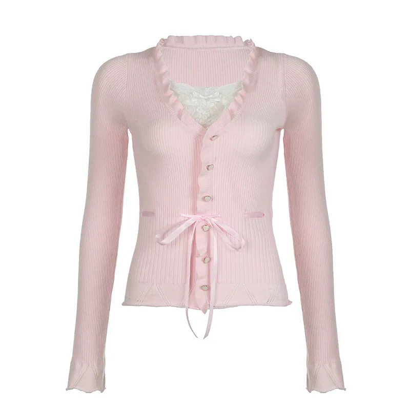 Lamuusaa Fairycore Clothing Top y2k Women Ruffle Lace Patchwork Long Sleeve Knitted T Shirt 2000s Coquette Clothes Streetwear