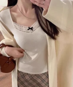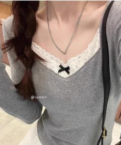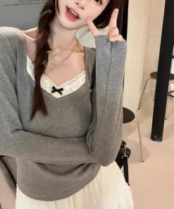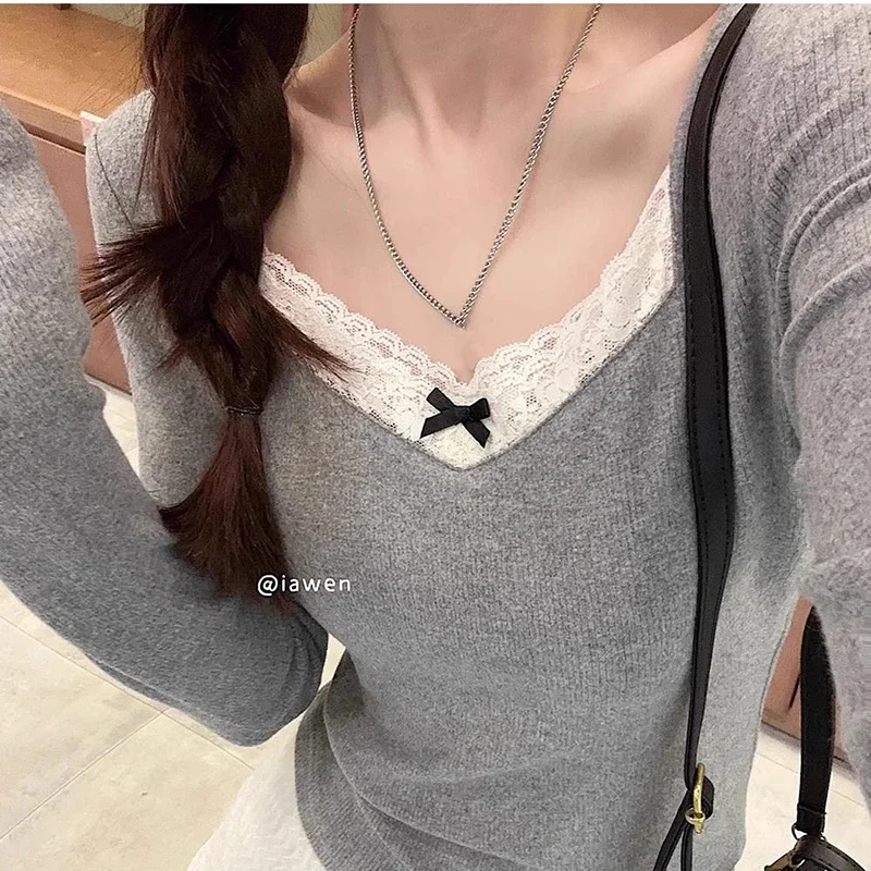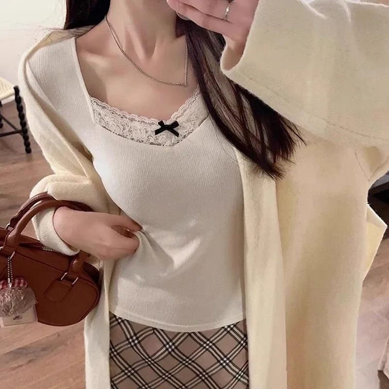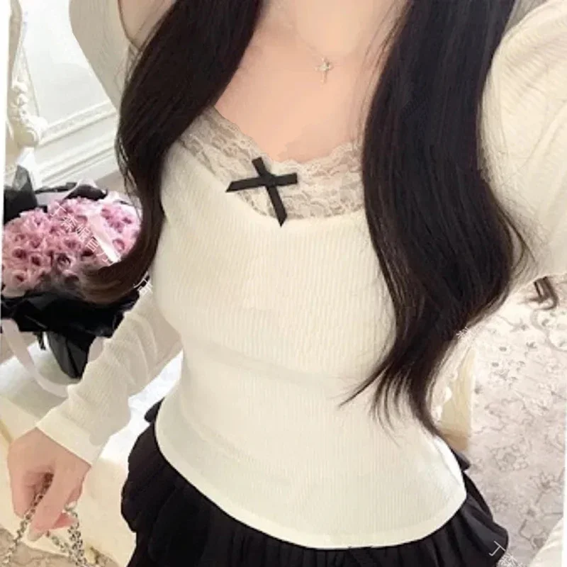 Long Sleeve T Shirt Women Lace Patchwork Warm Sweet Preppy Style Crop Tops Korean Fashion Chic Autumn Winter New Female Tees