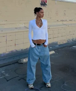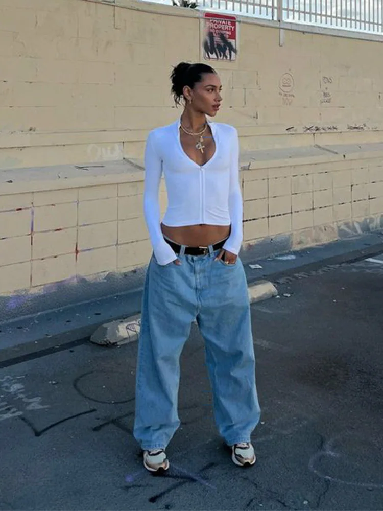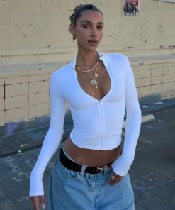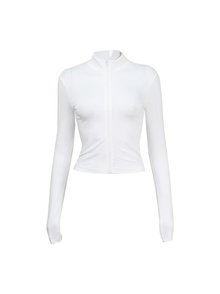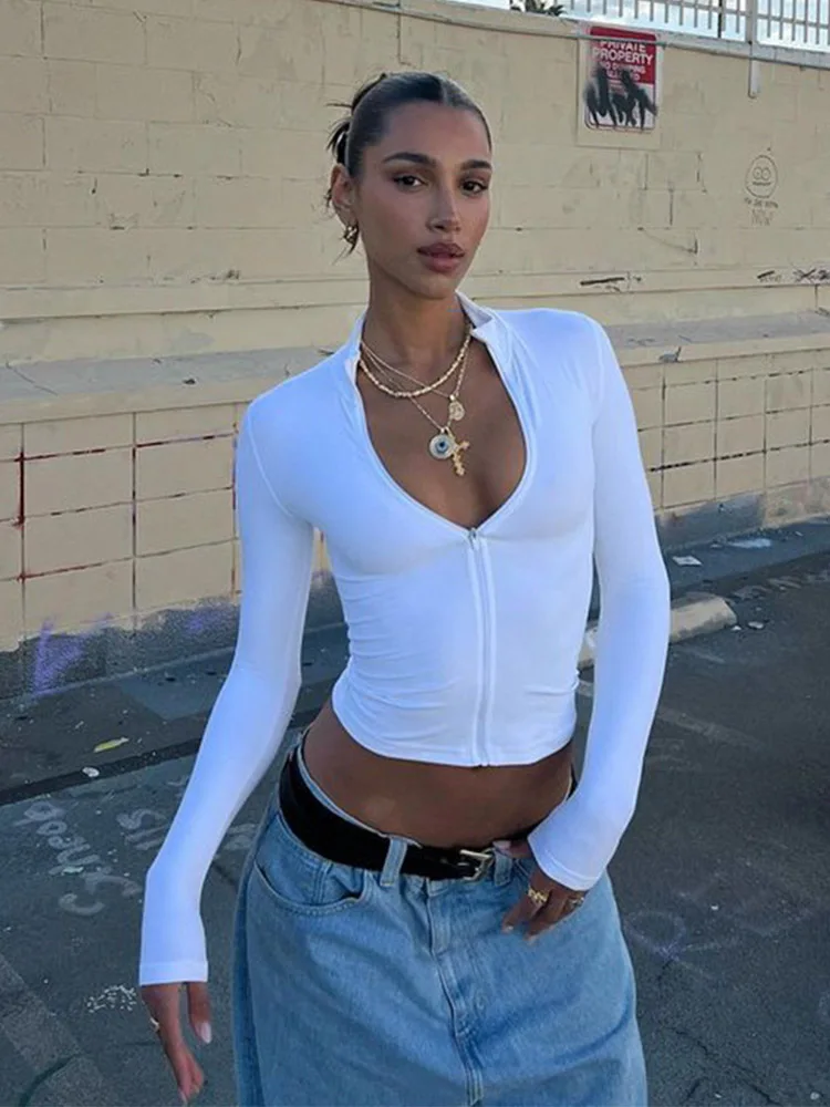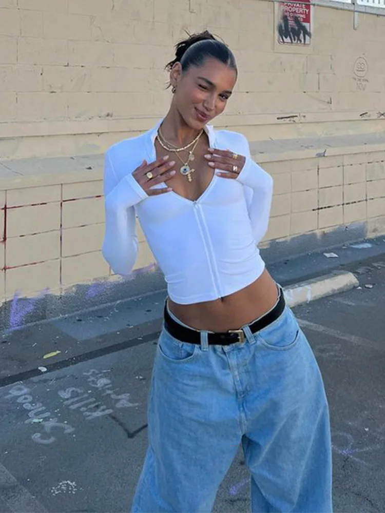 Long sleeved semi high neck zipper cardigan short style tight fitting spicy girl style fashionable crop top T-shirt