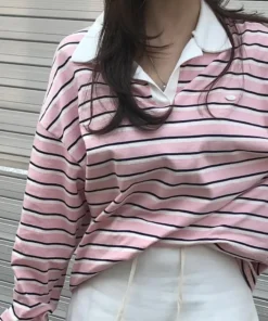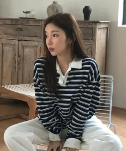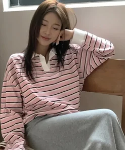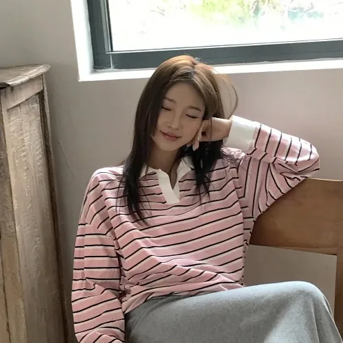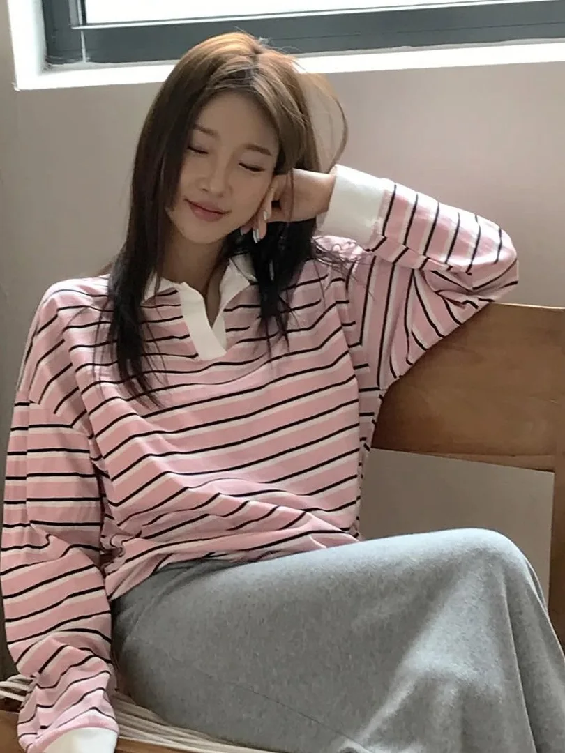Loose Long Sve T-irt Women’s Korean Sle Faionable Collared Base Layer Top Striped Boting irt Lazy Sle