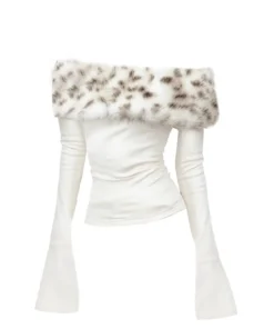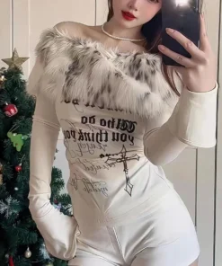 Luxury Fur Graphic Long sleeve T shirt Y2k Women Autumn Winter Off shoulder Tops 2000s Vintage Basic Blouse Tees White Shirt