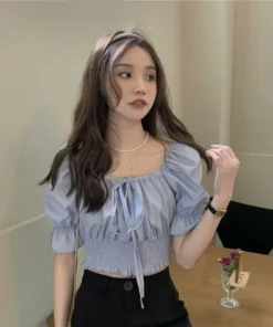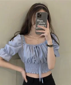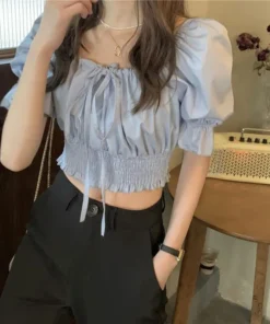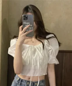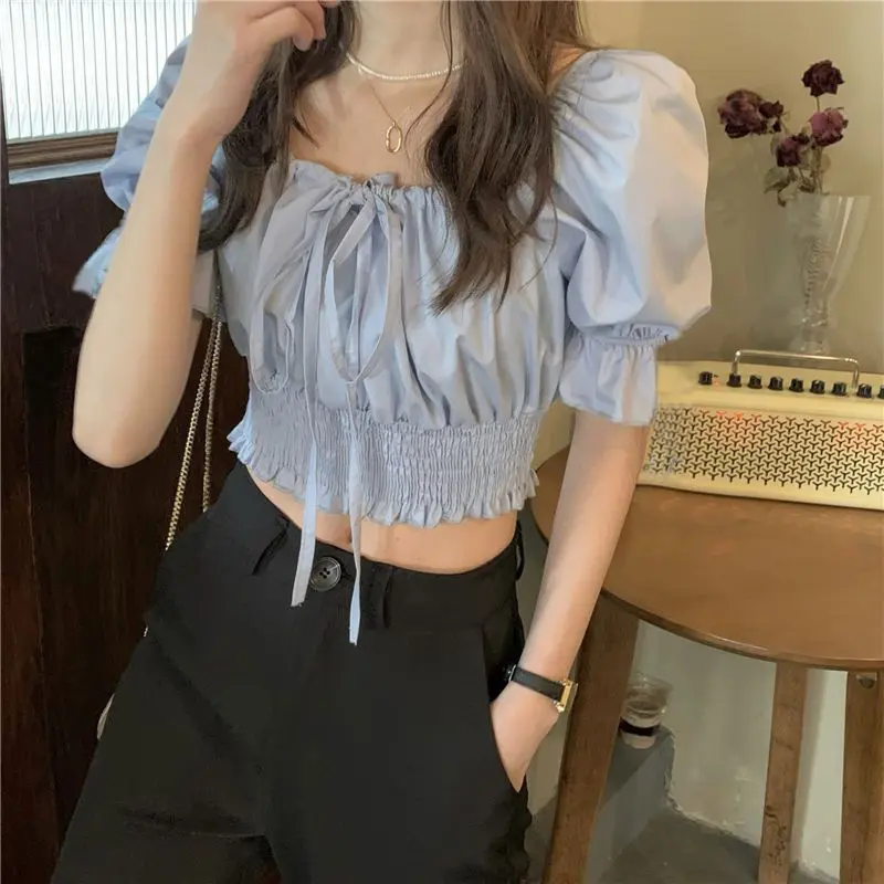 Off Shoulder Lace Up Bow Crop Top Blouse Women Summer Shirring Puff Short Sleeve Female Shirts Sweet Ruffle Tunic Korean Fashion