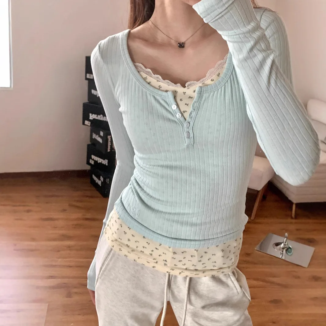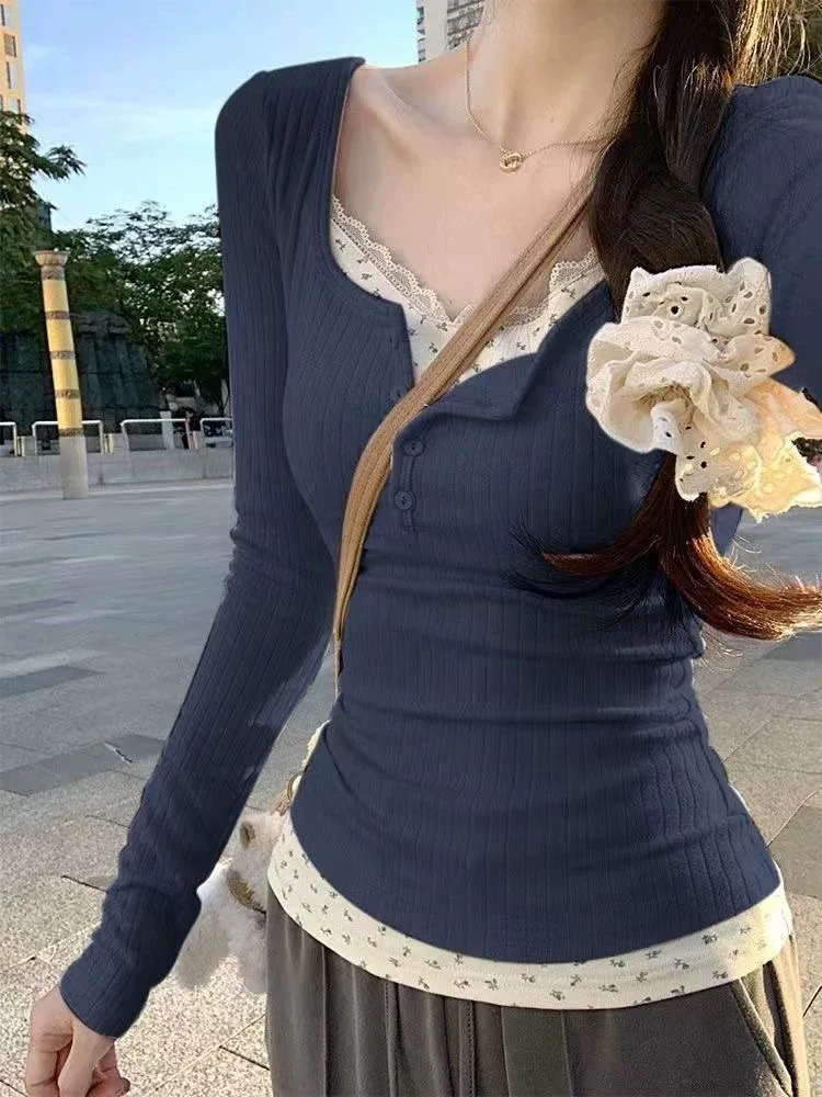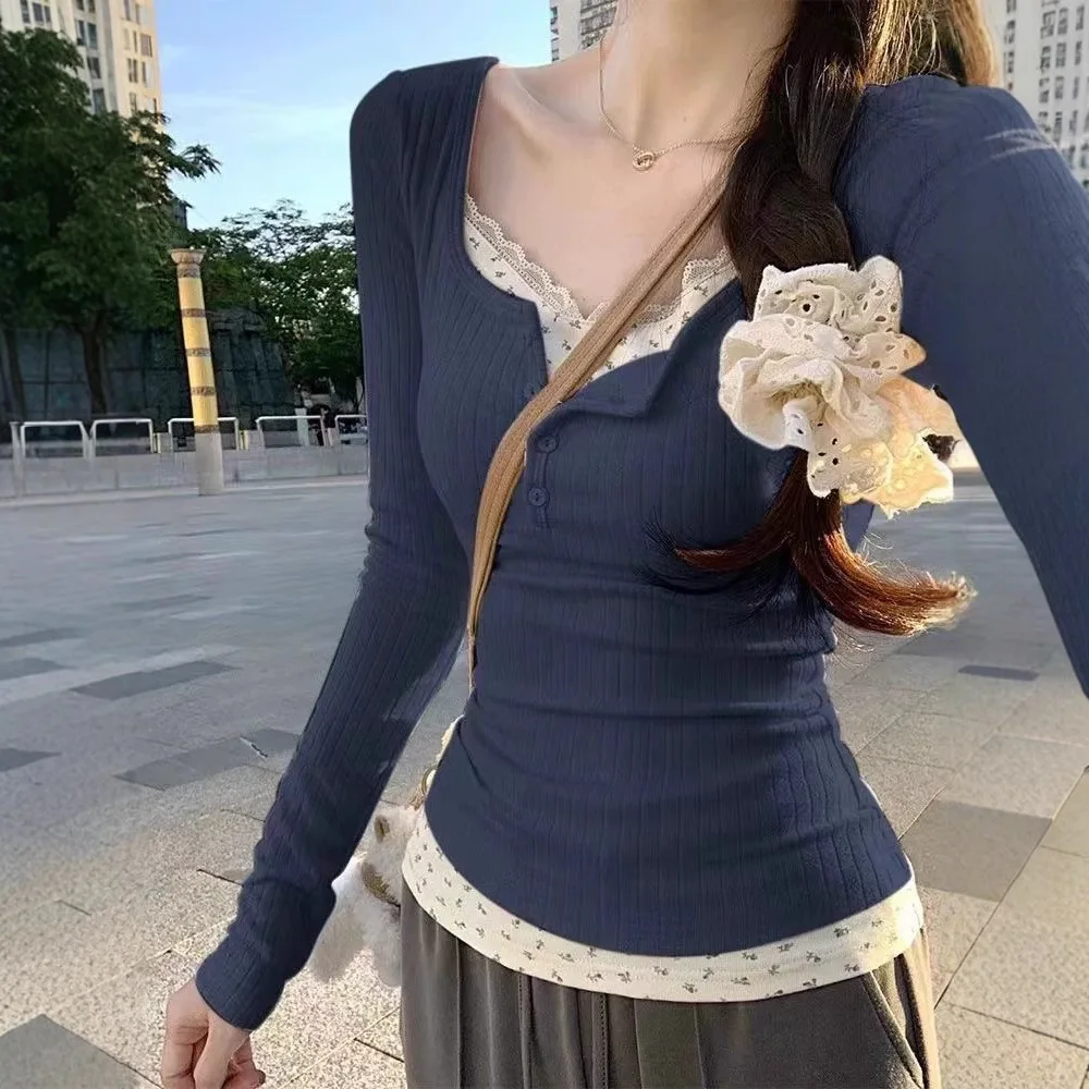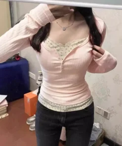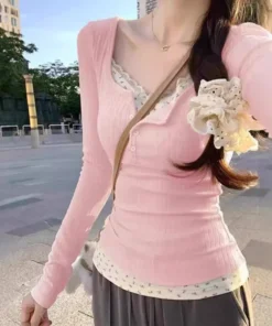 Pink Sweet Anti-Aging Sexy Big Collar Floral Lace Fake Two-Piece Long Sleeve Shirts Women’s Autumn Trendy Spicy Girl Top