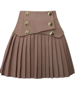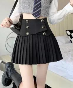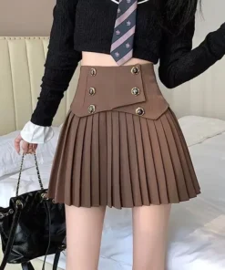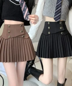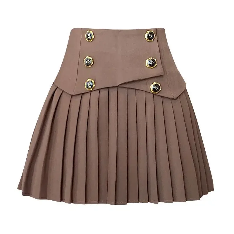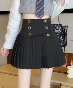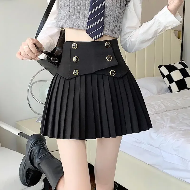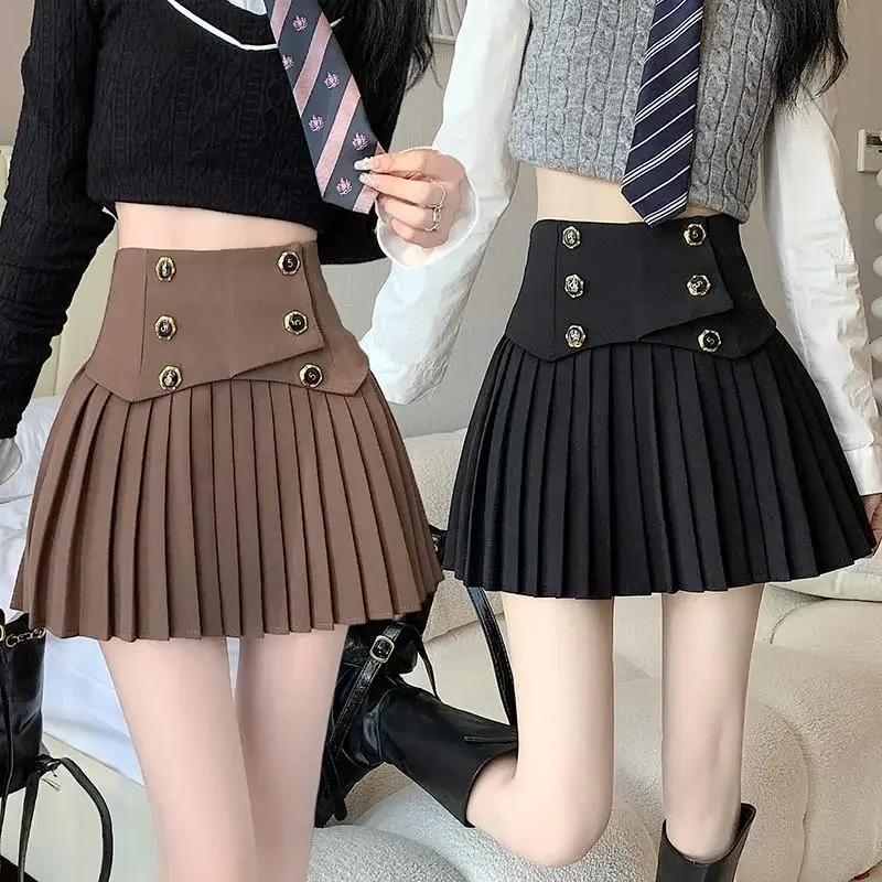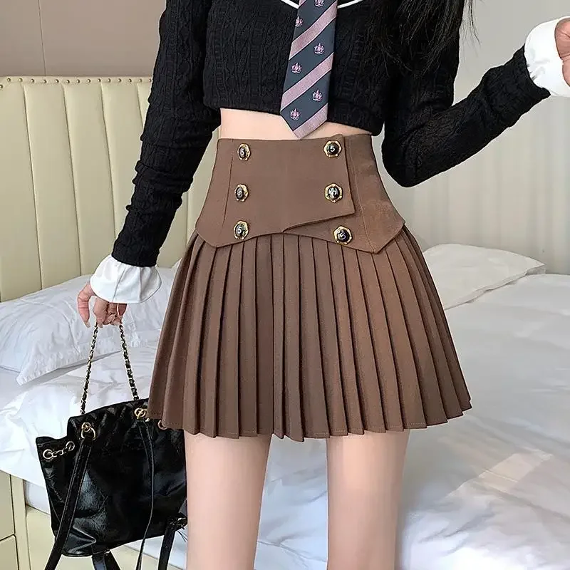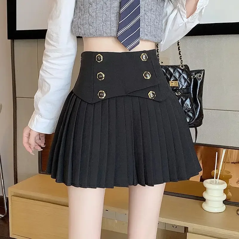 Pleated Skirt New Spring Autumn All-match Buttons Solid Color High Waist A-line Skirt Femme Preppy Style Pleated Trend Skirts