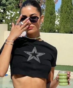 Rhinestones Stars Print Women Vintage Harajuku Short Tops Grunge Slim T Shirts Goth Baby Tees E-girl 2000s Crop Tops Y2K Clothes